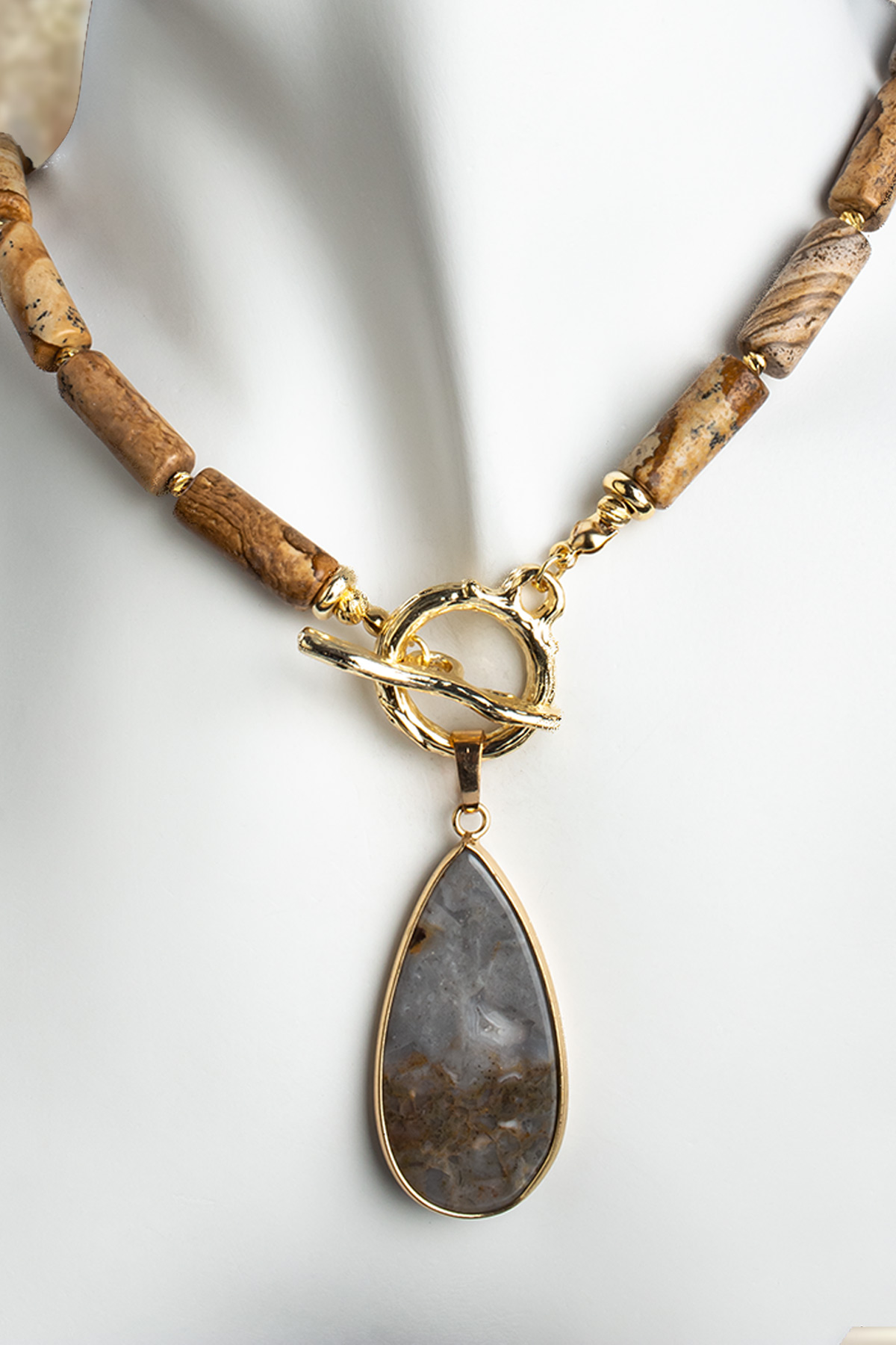 Ağaç Jasper Doğal Taş Silindir Kesim T Kapamalı Kolye (KLYDGL-0557)