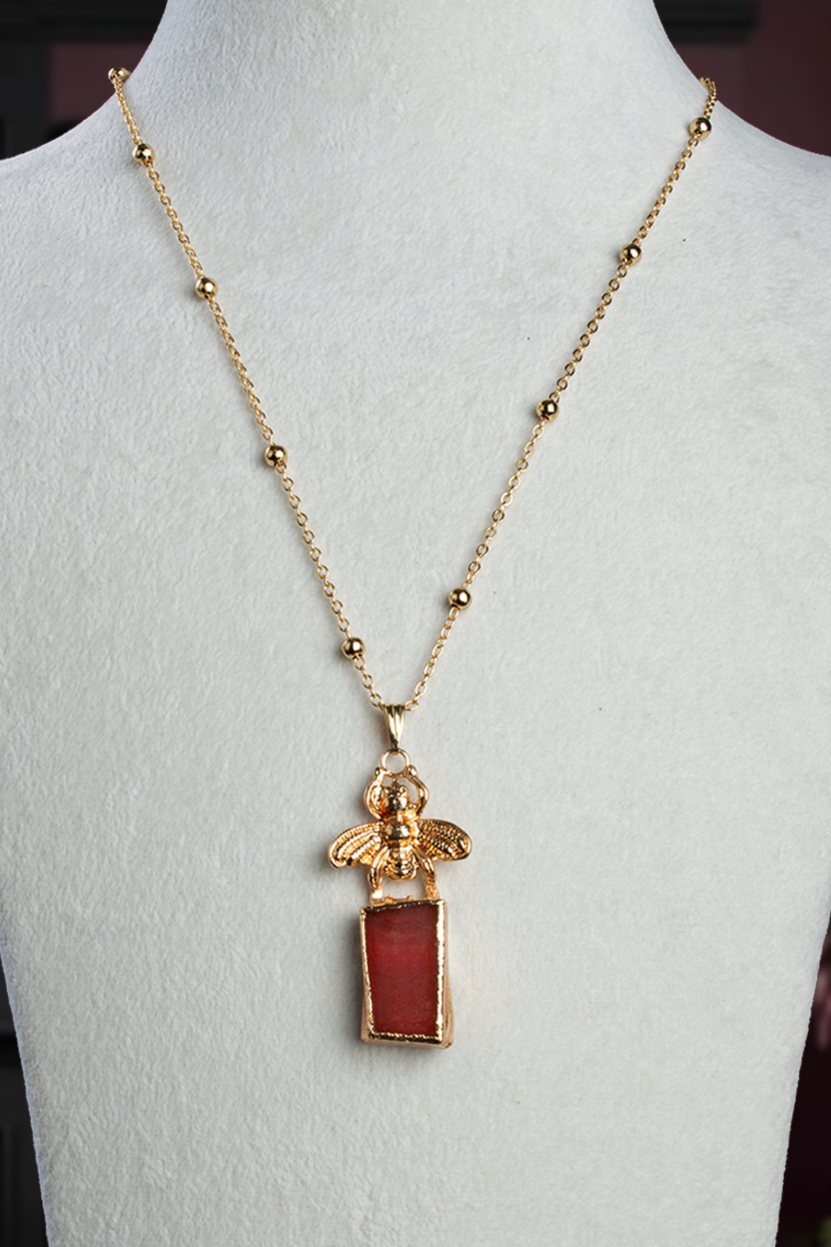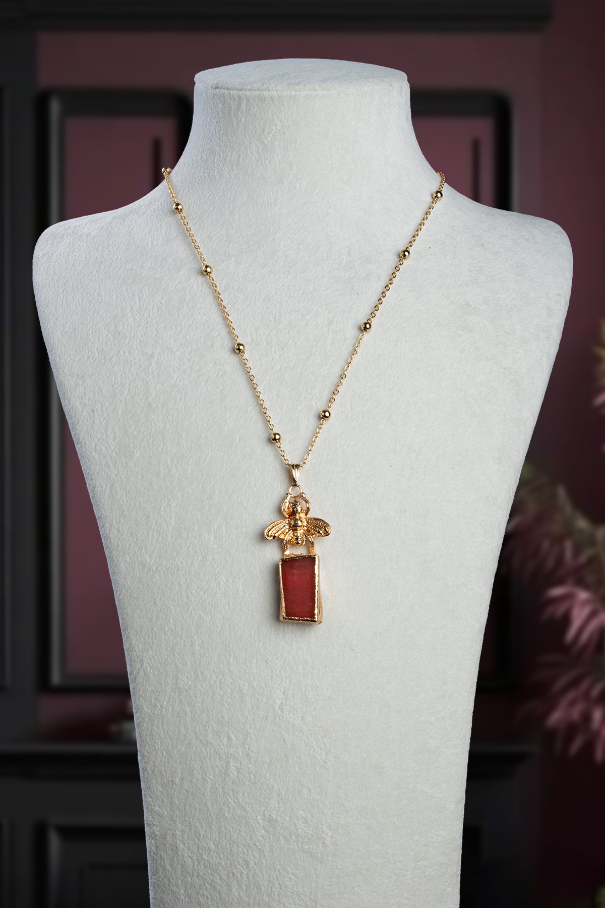 Akik Doğal Taş Kırmızı Tımbıl Kesim Arı Figürlü Lak Kaplama Kolye (KLYDGL-1541)