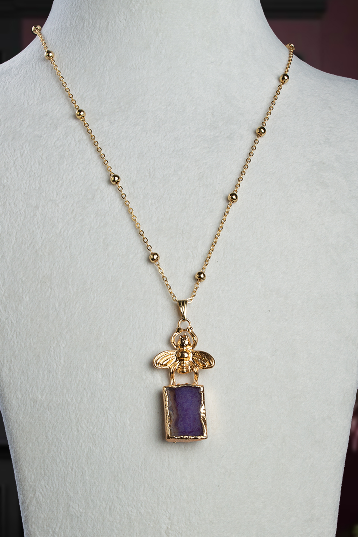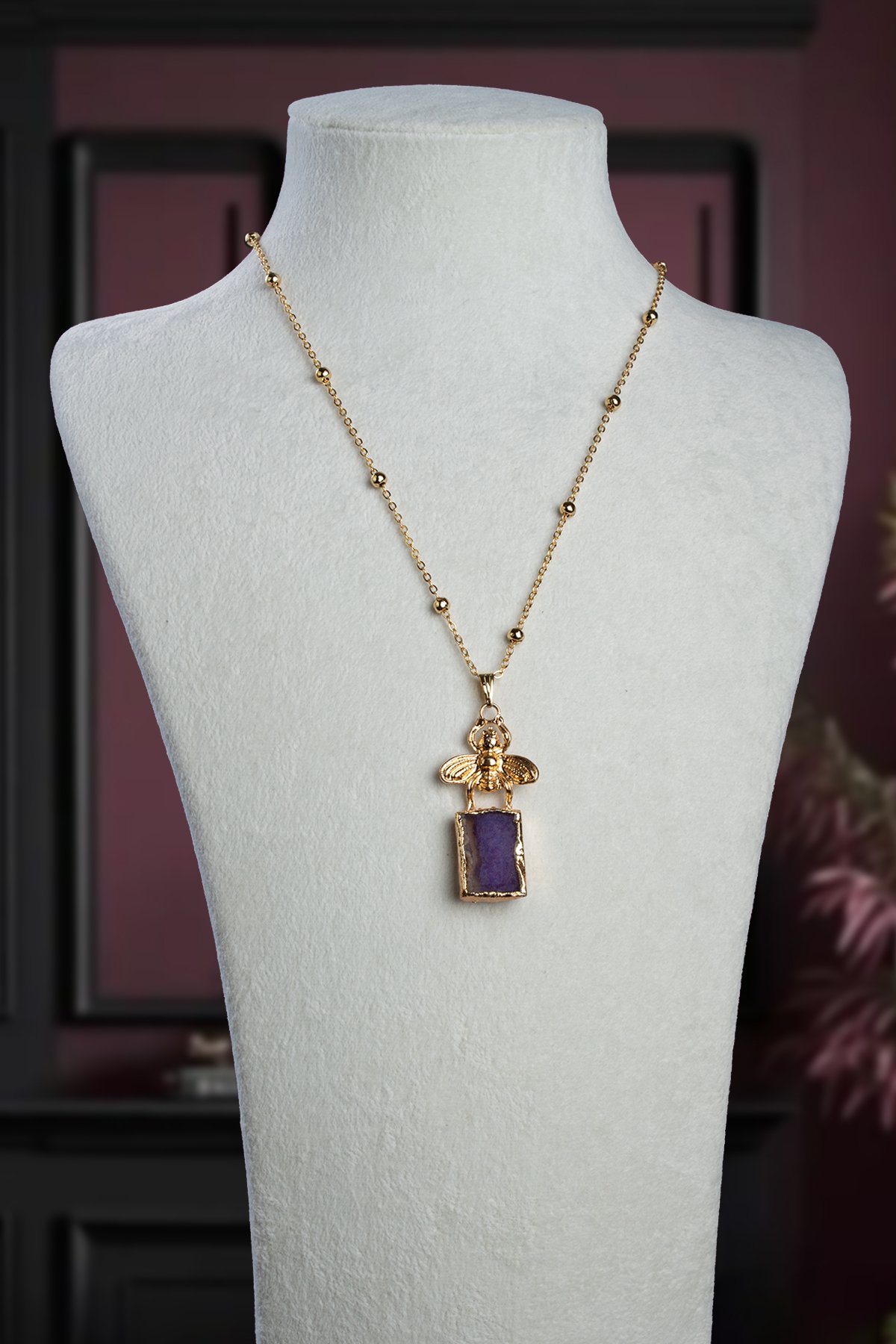 Akik Doğal Taş Mor Tımbıl Kesim Arı Figürlü Lak Kaplama Kolye (KLYDGL-1539)