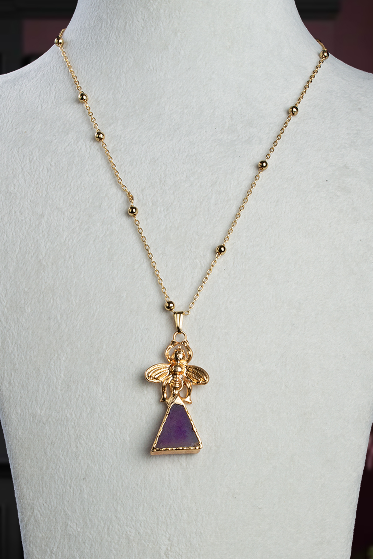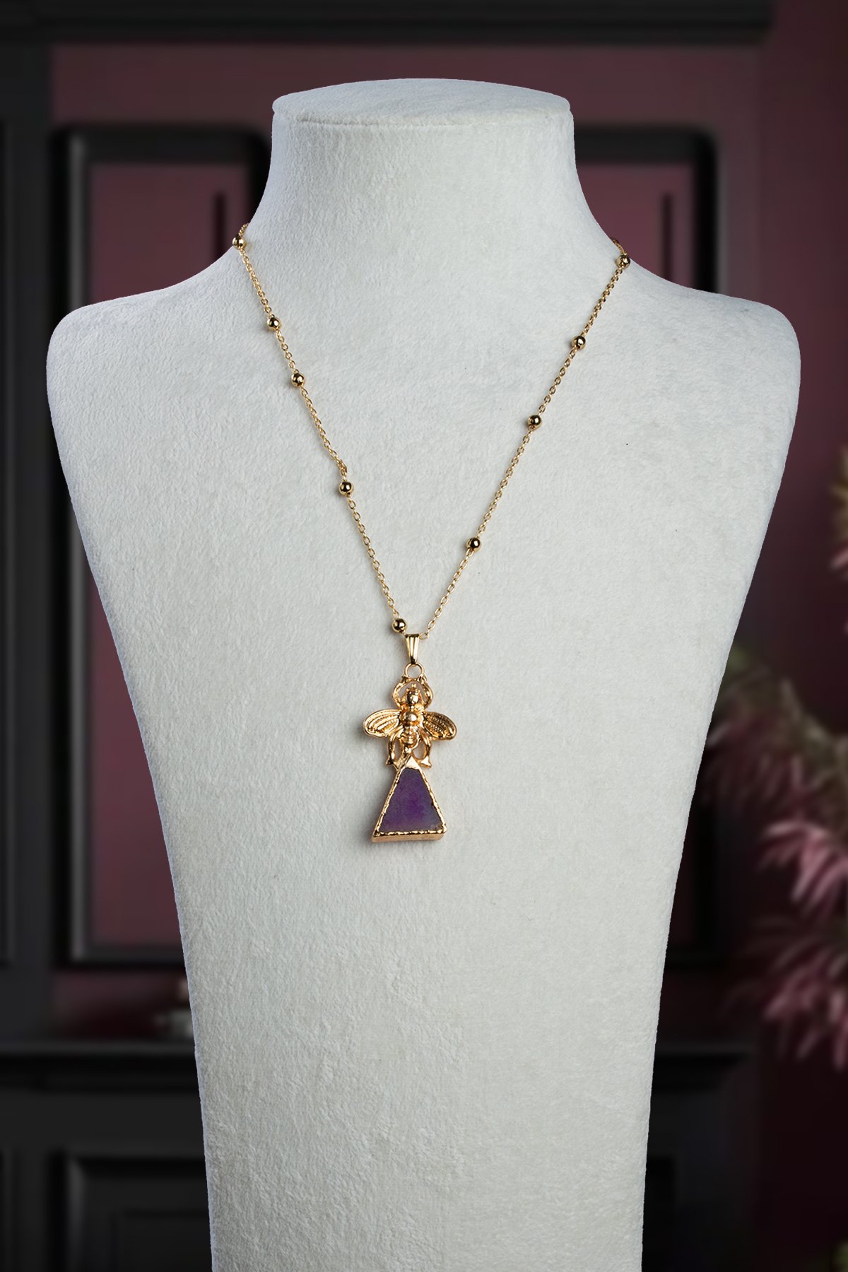 Akik Doğal Taş Mor Tımbıl Kesim Arı Figürlü Lak Kaplama Kolye (KLYDGL-1540)