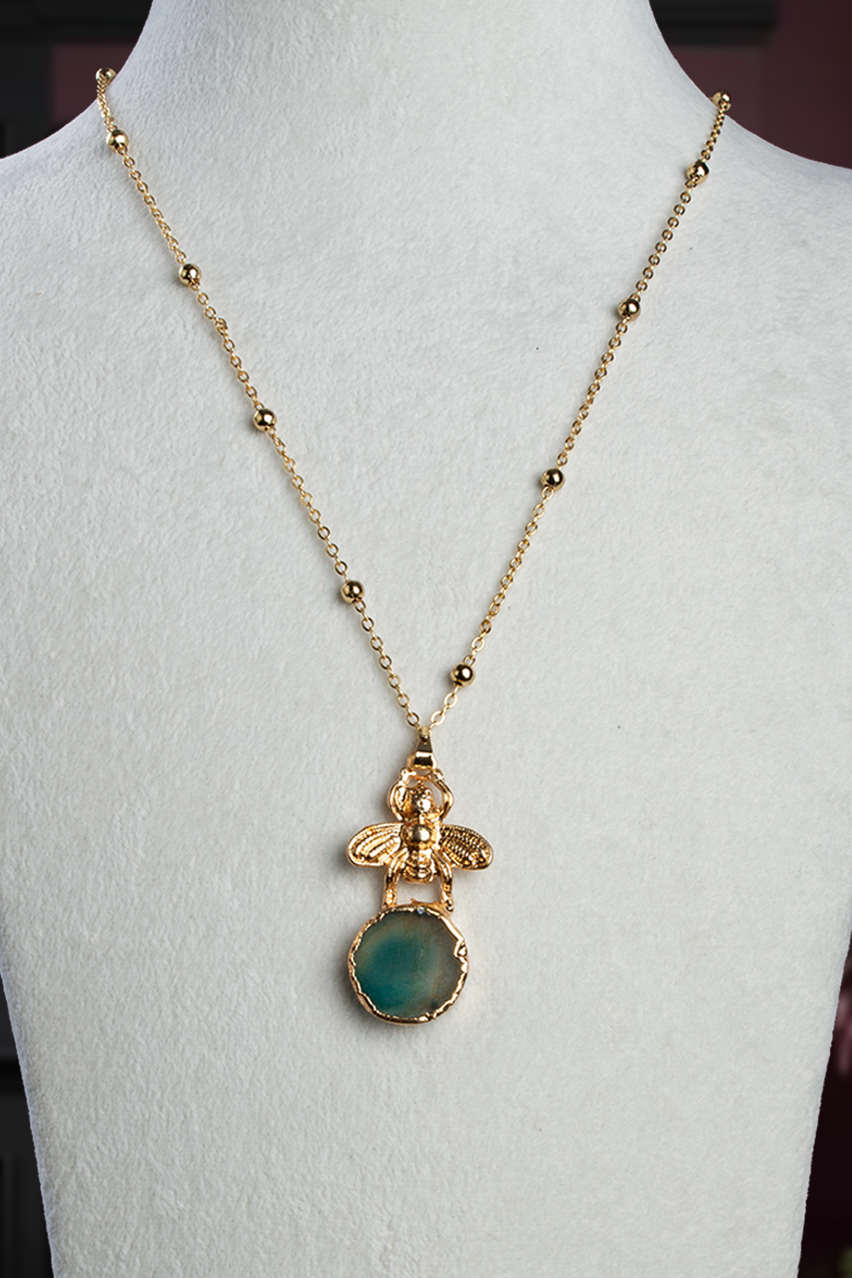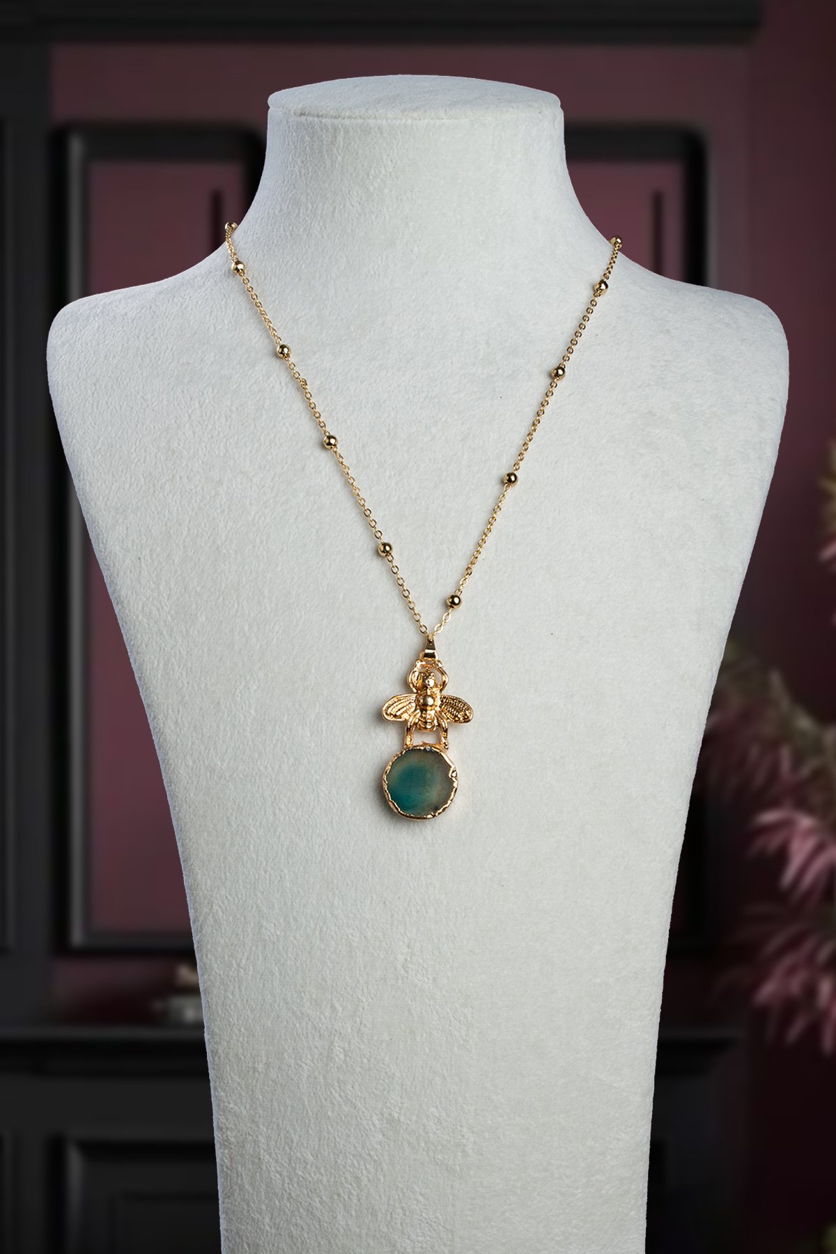 Akik Doğal Taş Yeşil Tımbıl Kesim Arı Figürlü Lak Kaplama Kolye (KLYDGL-1543)