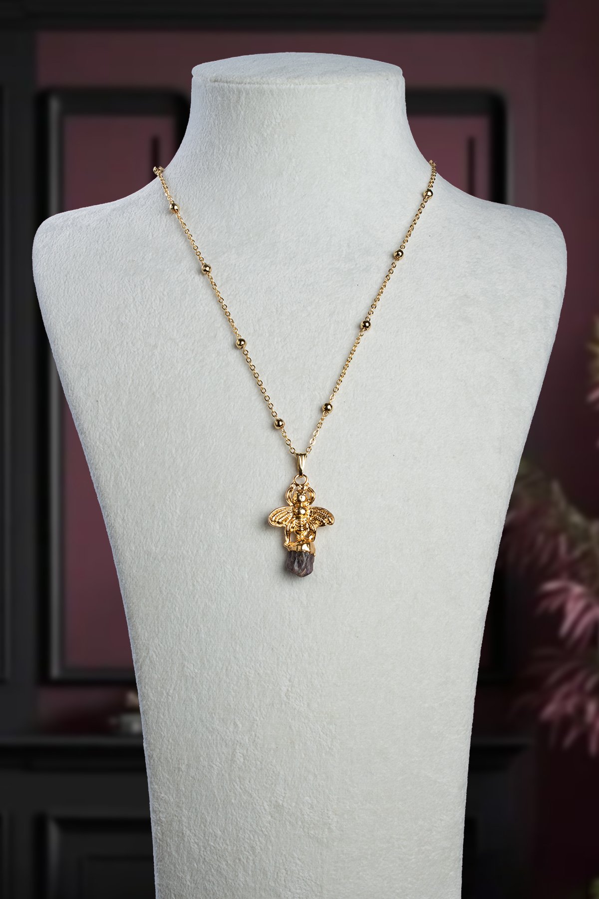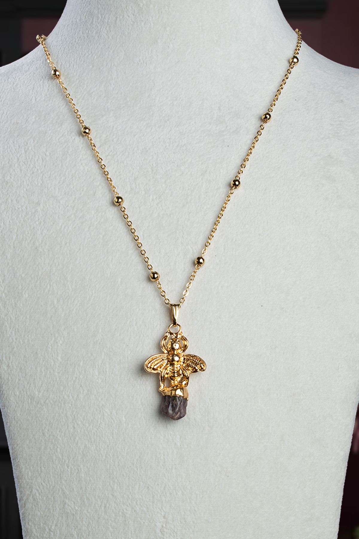 Ametist Doğal Taş Tımbıl Kesim Arı Figürlü Lak Kaplama Kolye (KLYDGL-1537)