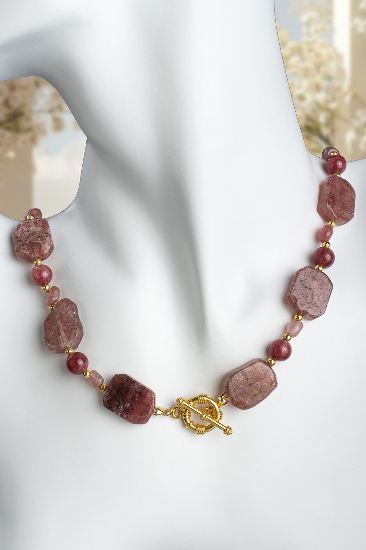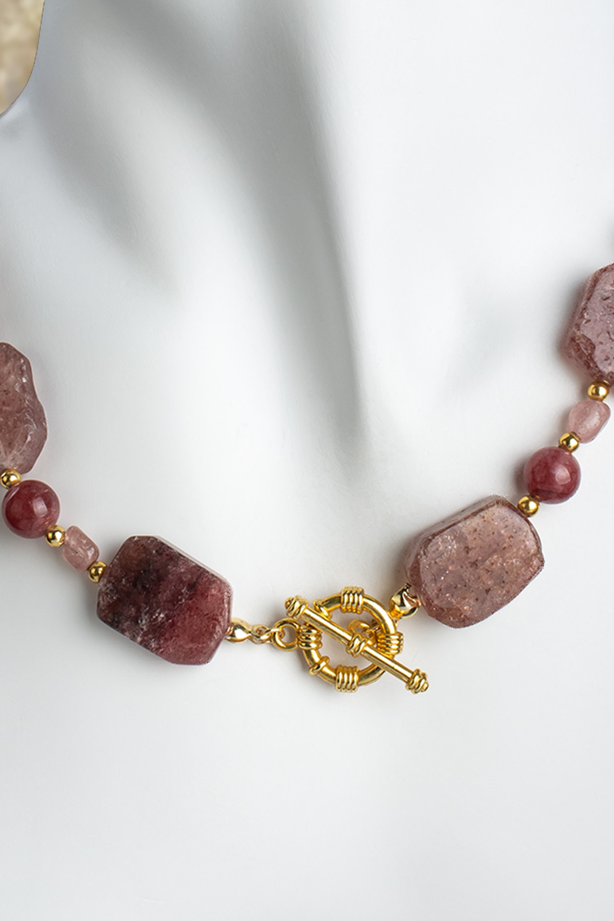 Çilek Kuvars Doğal Taş Özel Kesim T Kapamalı Kolye