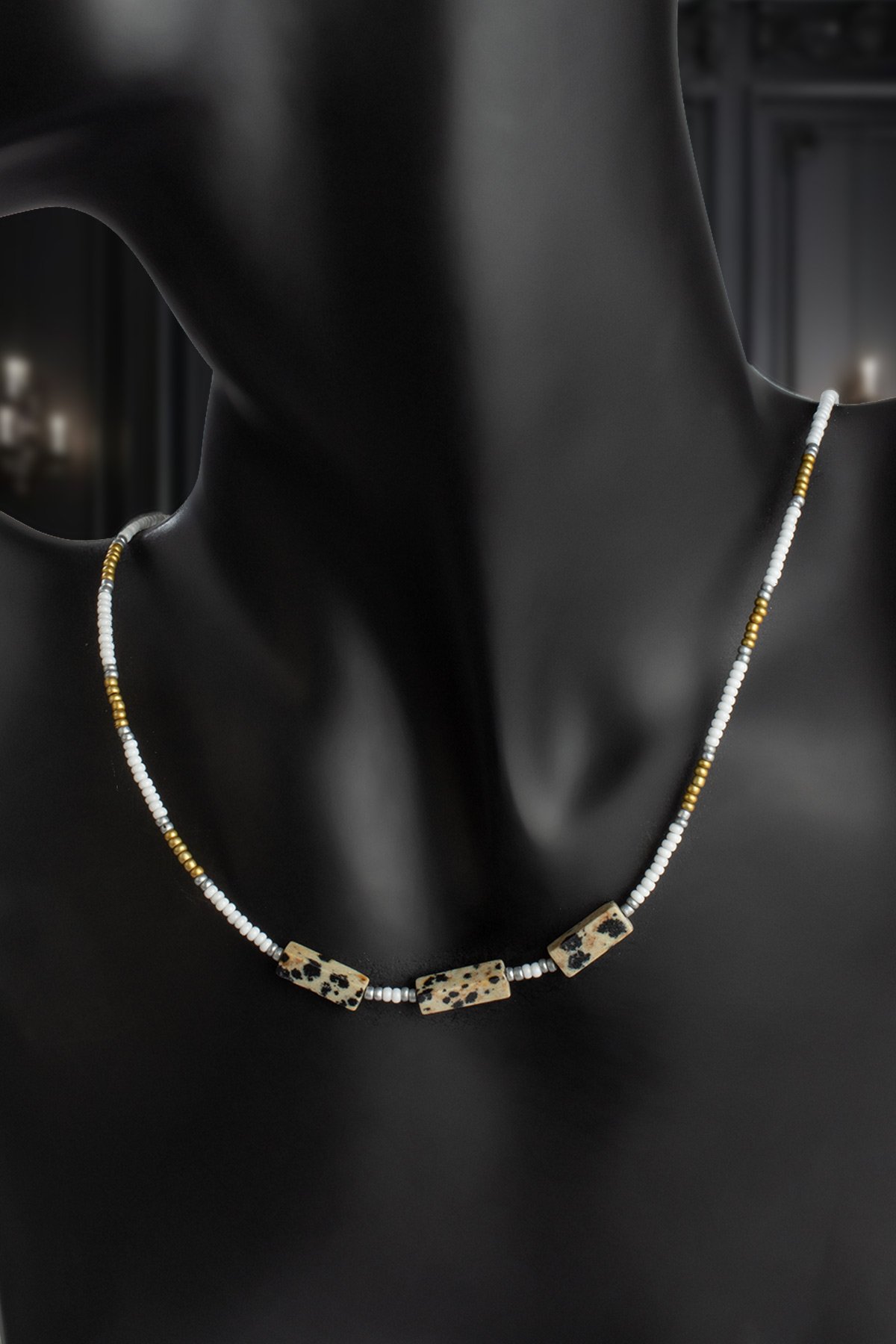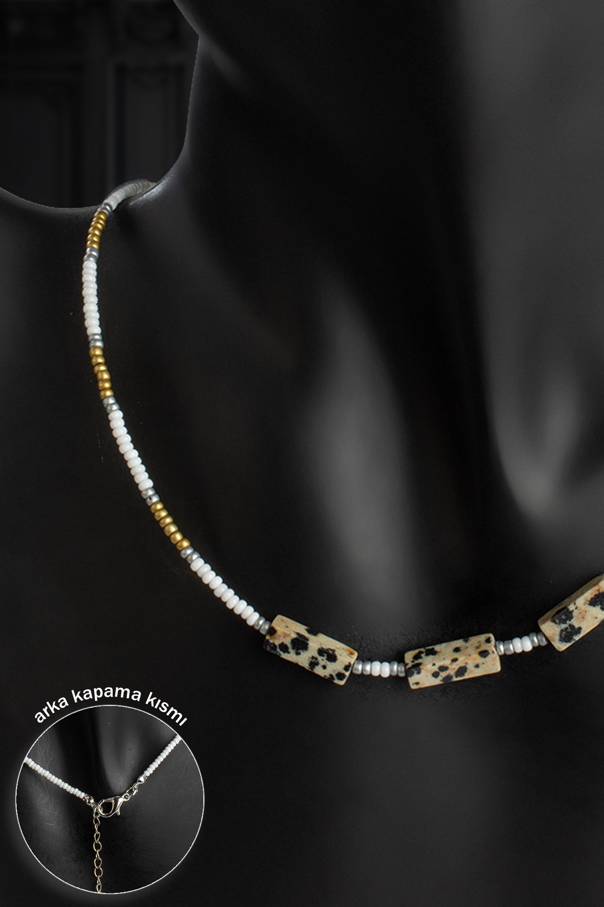Dalmaçyalı Jasper Doğal Taş Dikdörtgen Kesim Kum Boncuk Kolye (KLYDGL-0583)