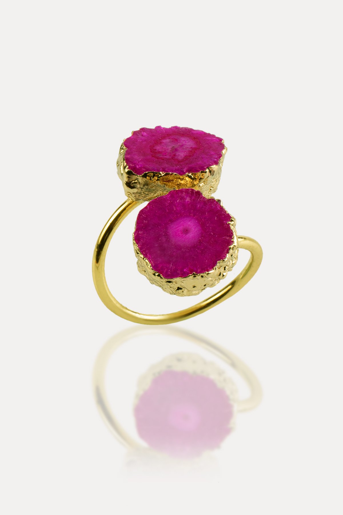 Akik Doğal Taş Fuşya Ham Kütle Kesim Pirinç Üzeri Altın Kaplama Ayarlanabilir Yüzük