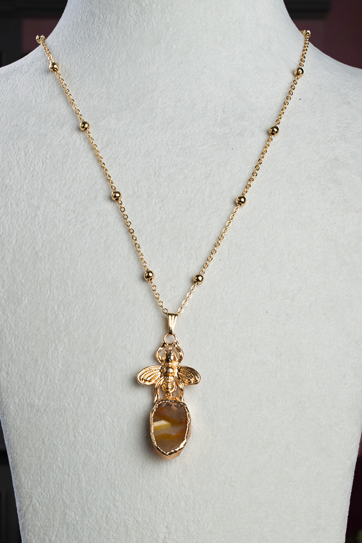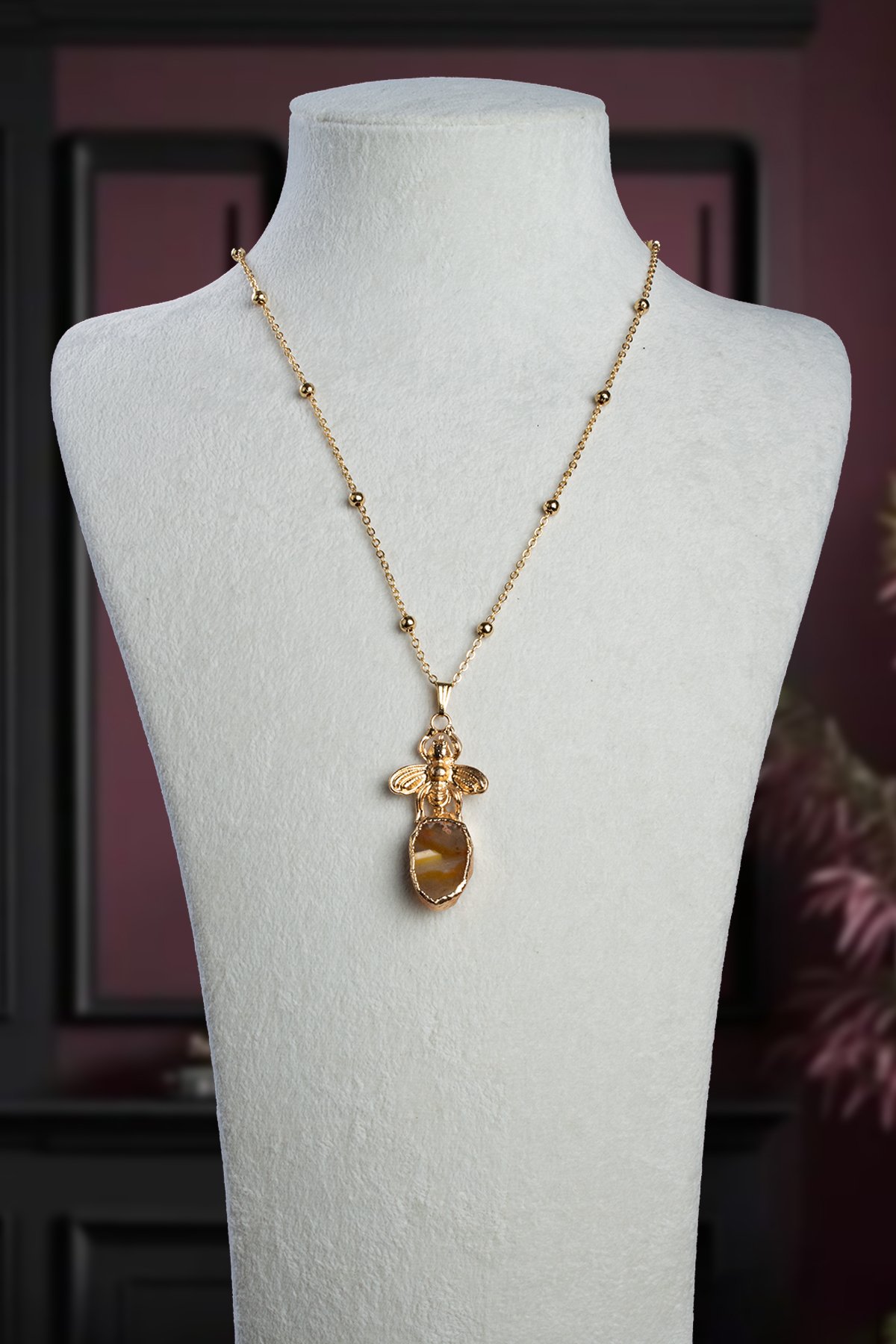 Akik Doğal Taş Kahverengi Tımbıl Kesim Arı Figürlü Lak Kaplama Kolye (KLYDGL-1550)
