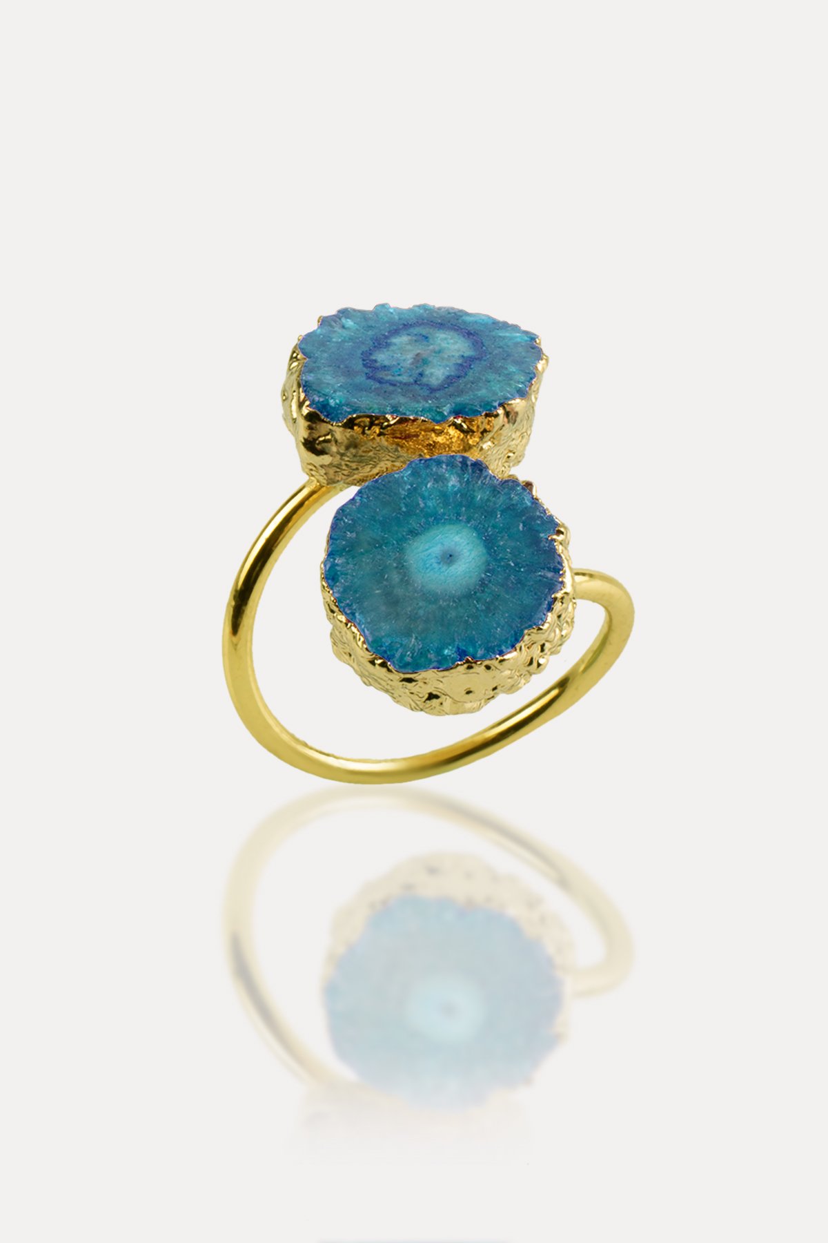 Akik Doğal Taş Mavi Ham Kütle Kesim Pirinç Üzeri Altın Kaplama Ayarlanabilir Yüzük