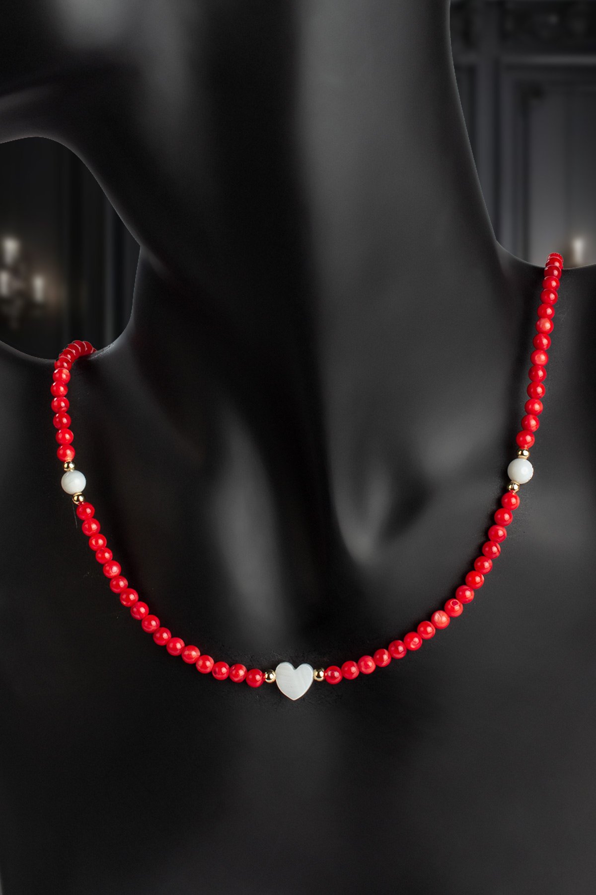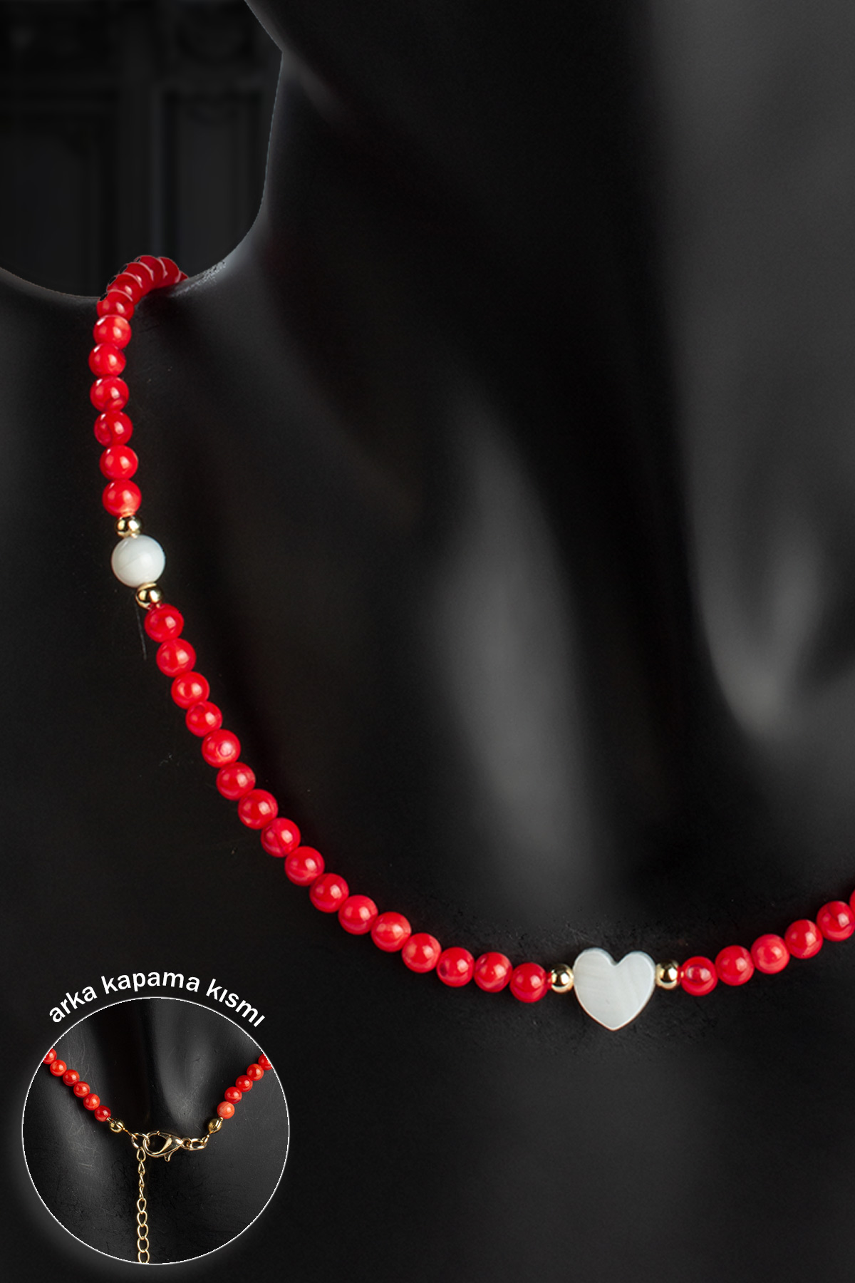 Sedef Doğal Taş Kırmızı Küre & Kalp Kesim Kolye (KLYDGL-0412)