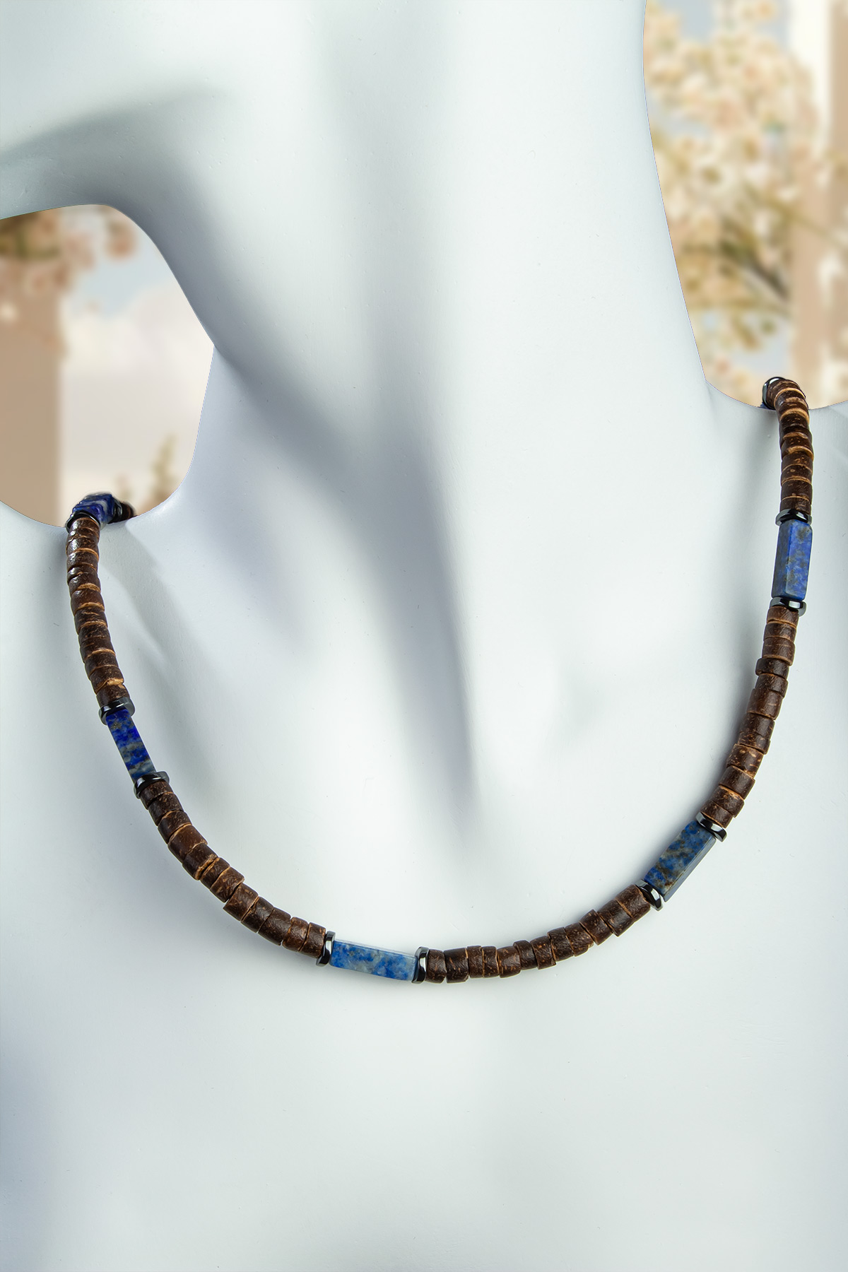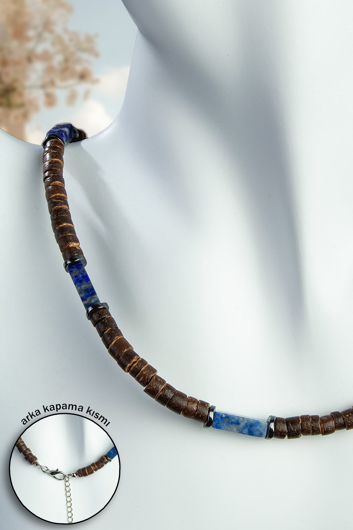 Hindistan Cevizi Ağacı - Lapis Lazuli Doğal Taş Dikdörtgen Kesim Zincir Kapamalı Kolye