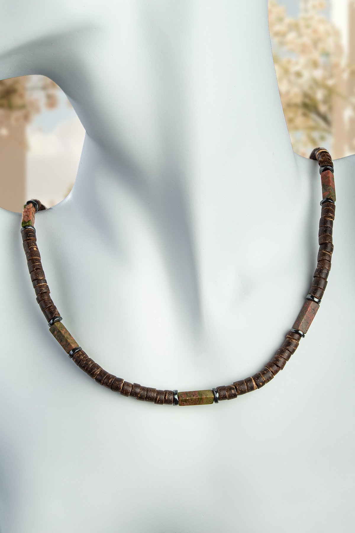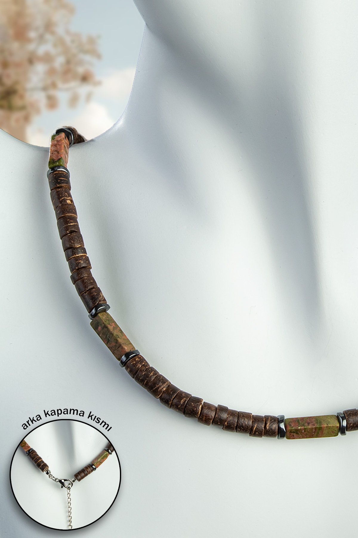 Hindistan Cevizi Ağacı - Unakit Doğal Taş Dikdörtgen Kesim Zincir Kapamalı Kolye