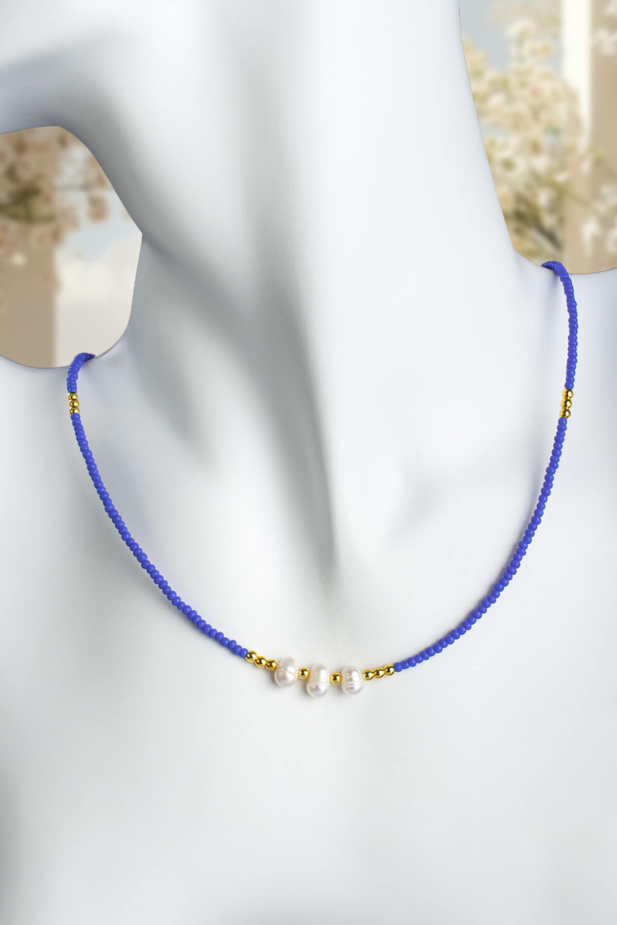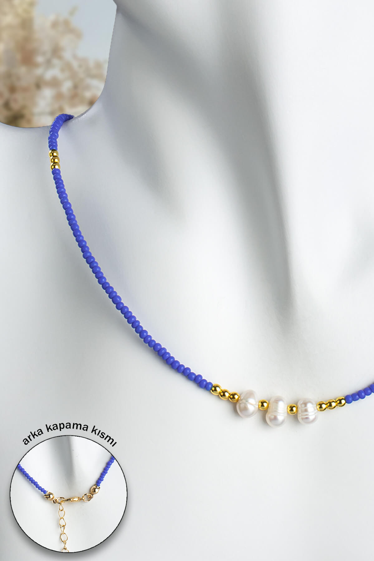 İnci Doğal Taş & Lacivert Kum Boncuk Zincir Kapamalı Kolye (KLYDGL-0416)