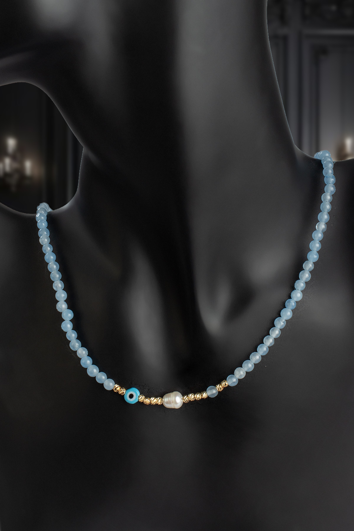 İnci - Sıkma Doğal Taş Mavi Küre Kesim Kolye (KLYDGL-0469)