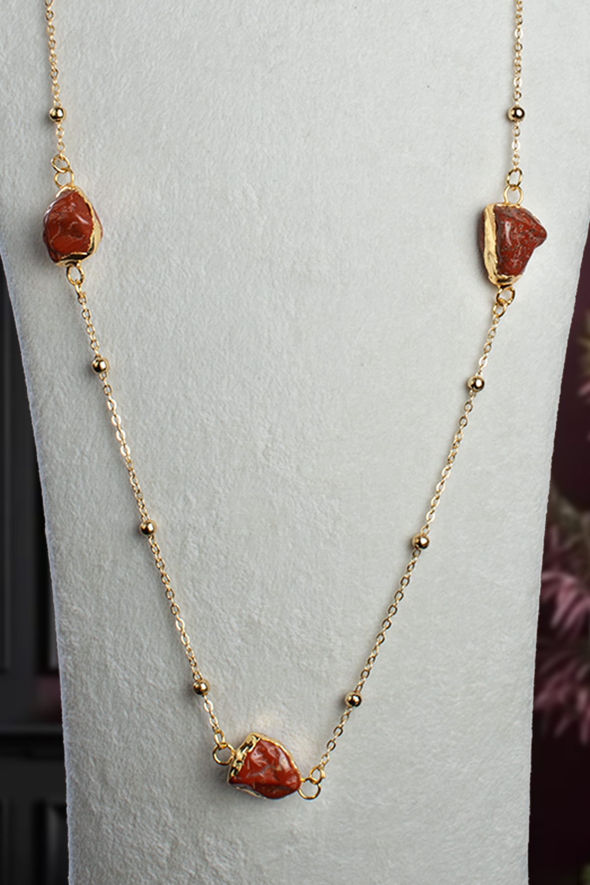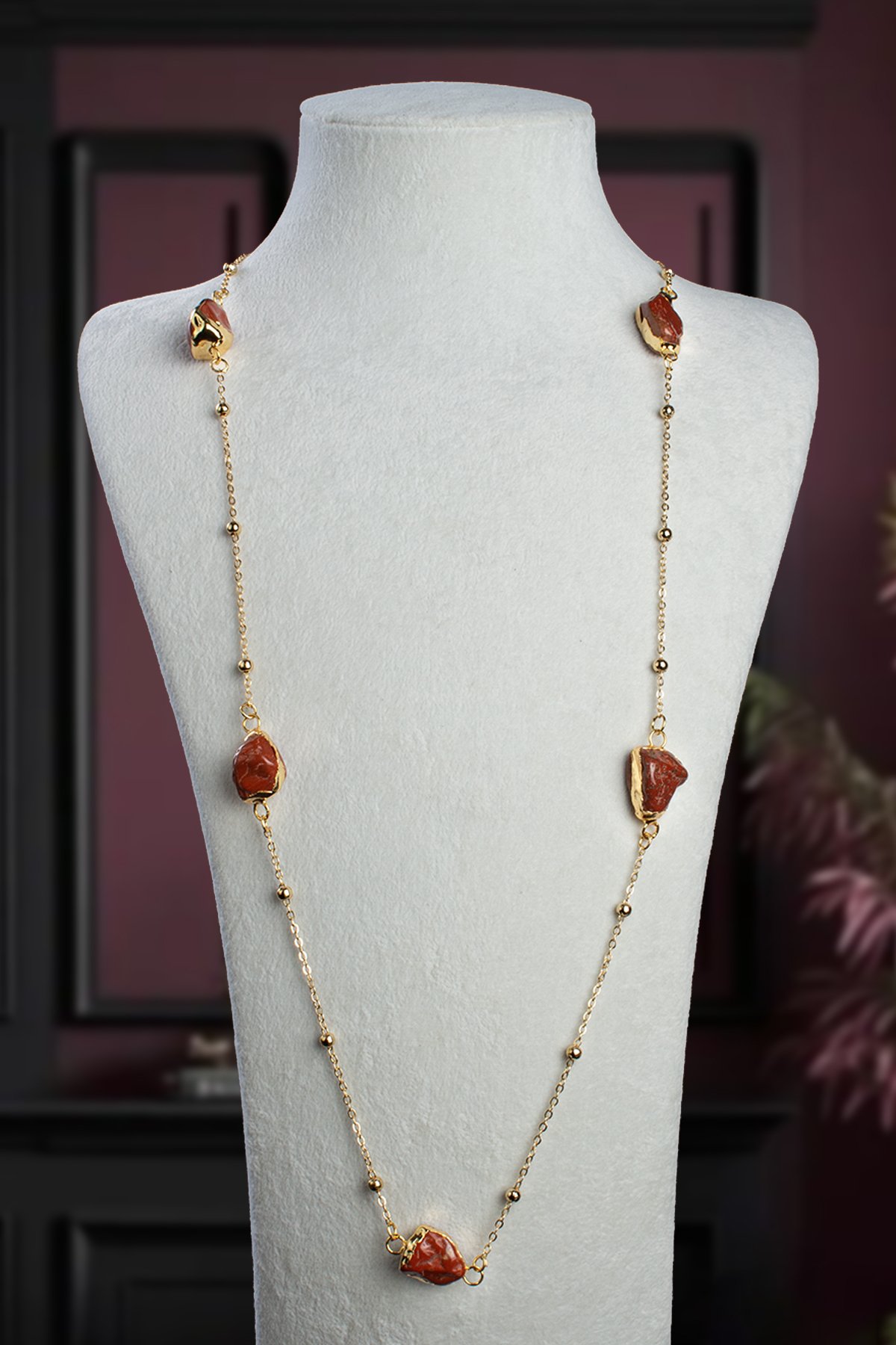 Jasper Doğal Taş Kırmızı Tamburlu Kütle Taş Uzun Zincir Kolye (KLYDGL-1524)