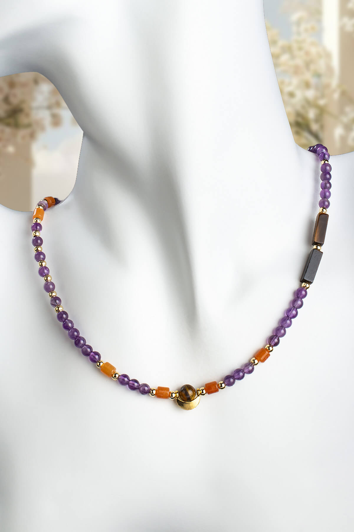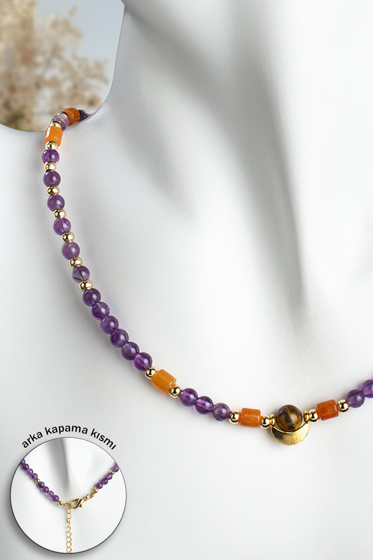 Kaplan Gözü - Ametist Doğal Taş Küre Kesim Zincir Kapamalı Kolye