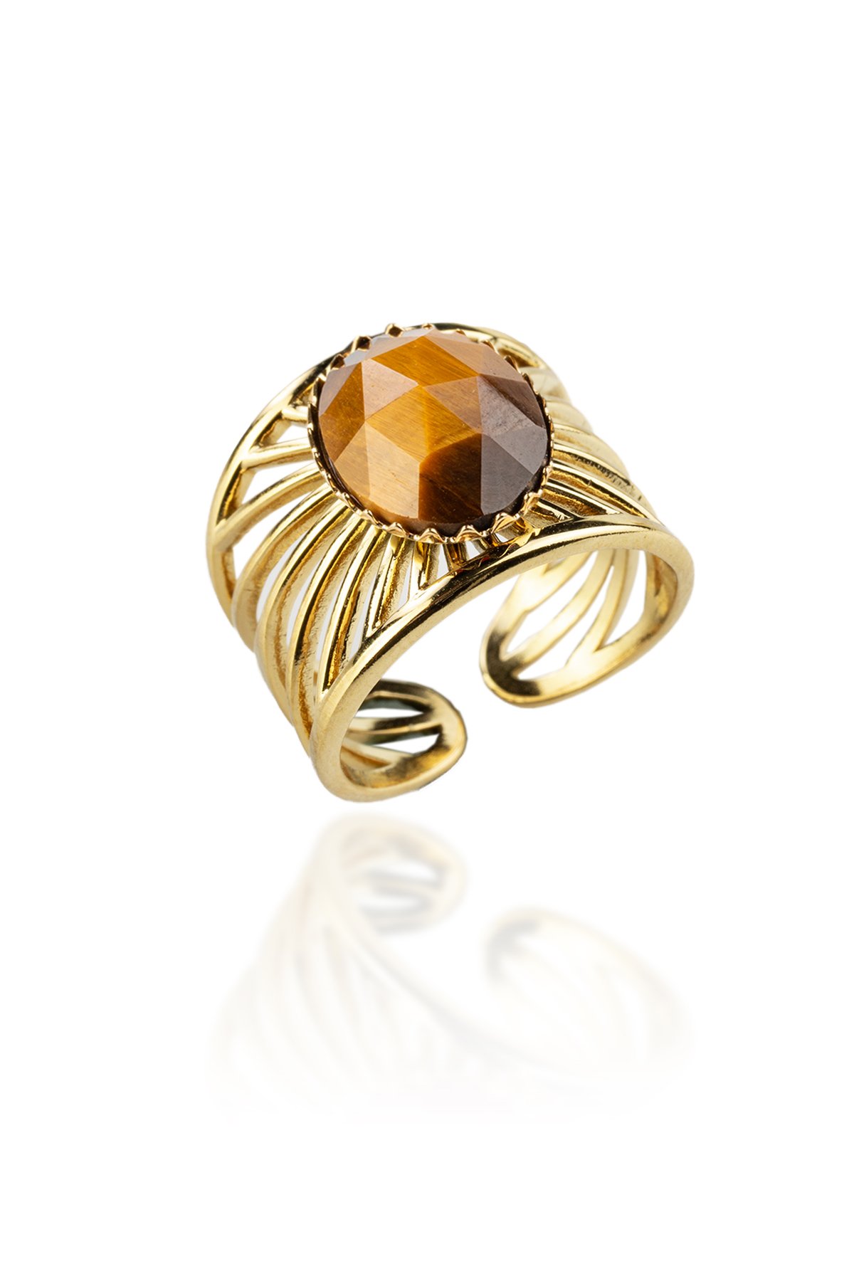 Kaplan Gözü Doğal Taş Çelik Faset Oval Kesim Ayarlanabilir Yüzük