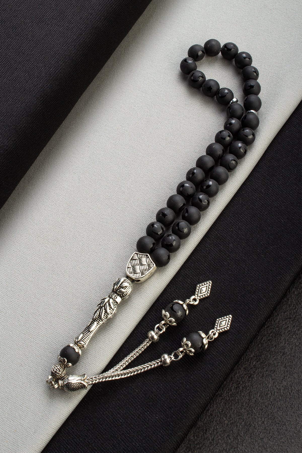 Oniks Doğal Taş Küre Kesim 33 lu Ay Yıldız Motifli 8mm Tesbih