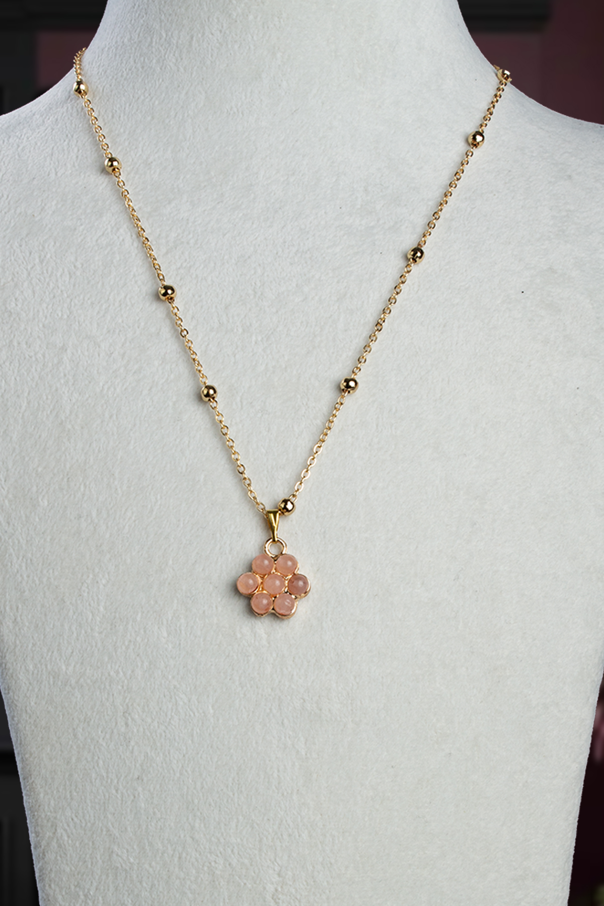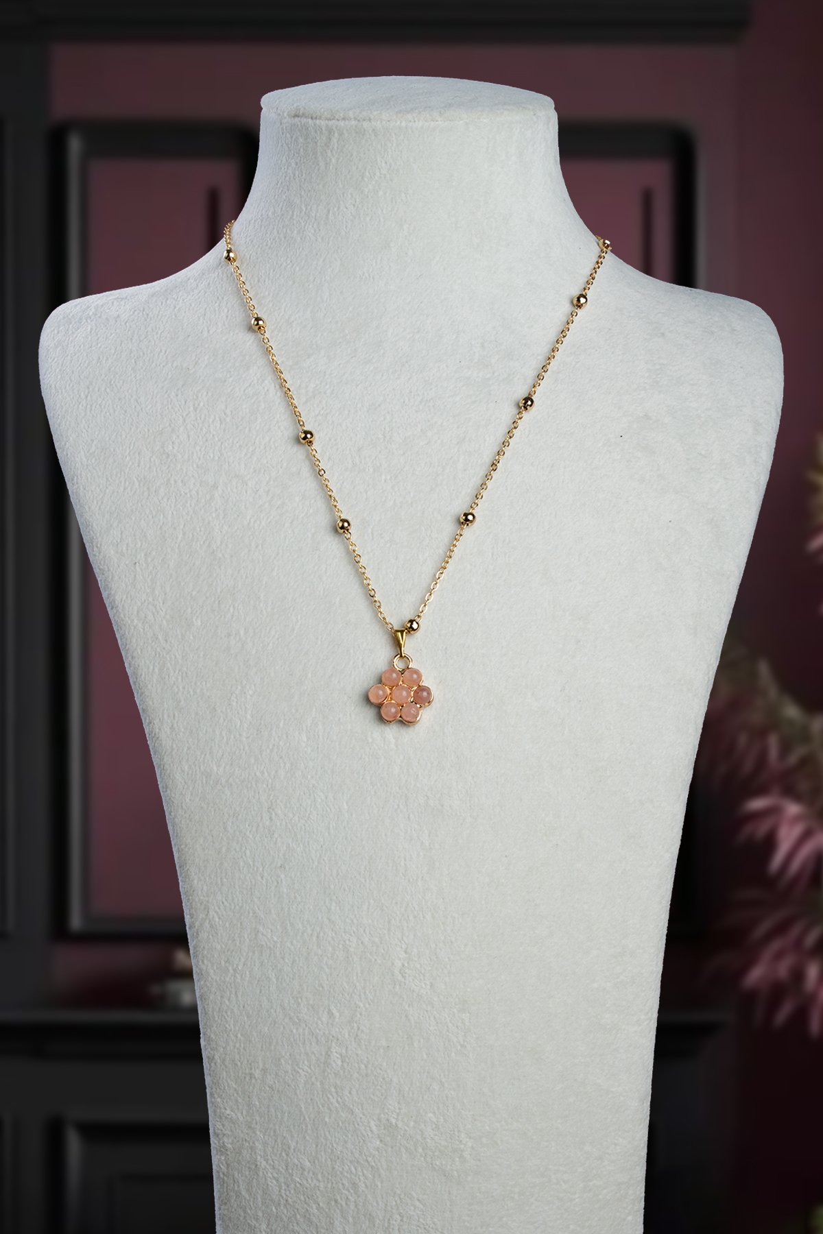 Pembe Kuvars Doğal Taş Çiçek Kesim Kolye (KLYDGL-0667)