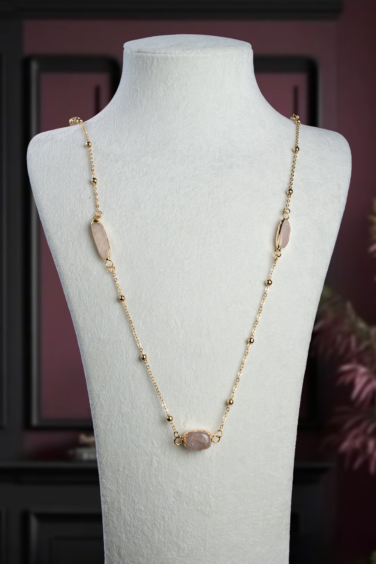 Pembe Kuvars Doğal Taş Tamburlu Kütle Taş Uzun Zincir Kolye