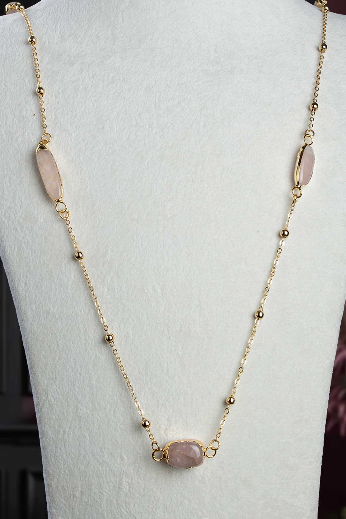 Pembe Kuvars Doğal Taş Tamburlu Kütle Taş Uzun Zincir Kolye (KLYDGL-0638)