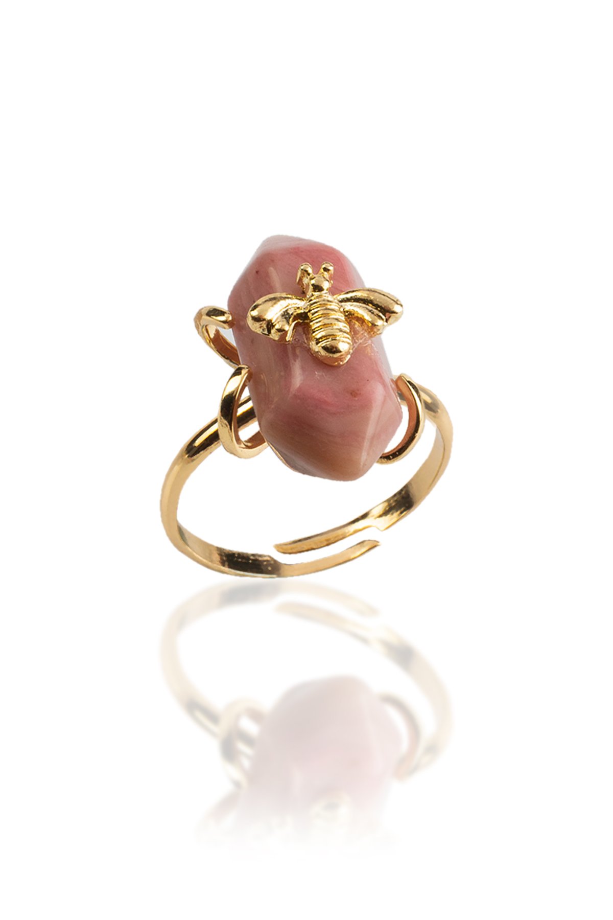 Rodonit Doğal Taş Çift Uçlu Prizma Kesim Pirinç Üzeri Altın Kaplama Ayarlanabilir Yüzük