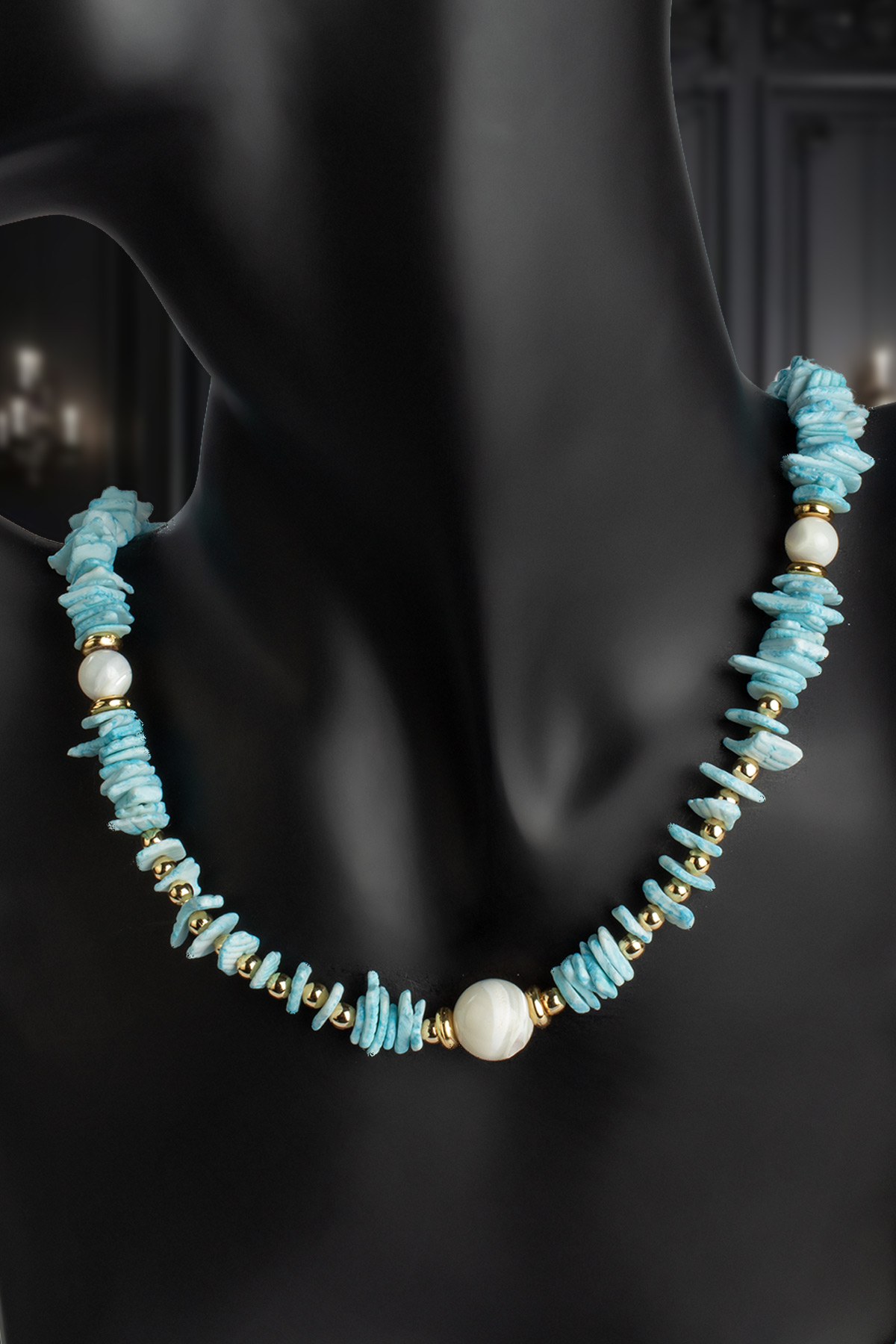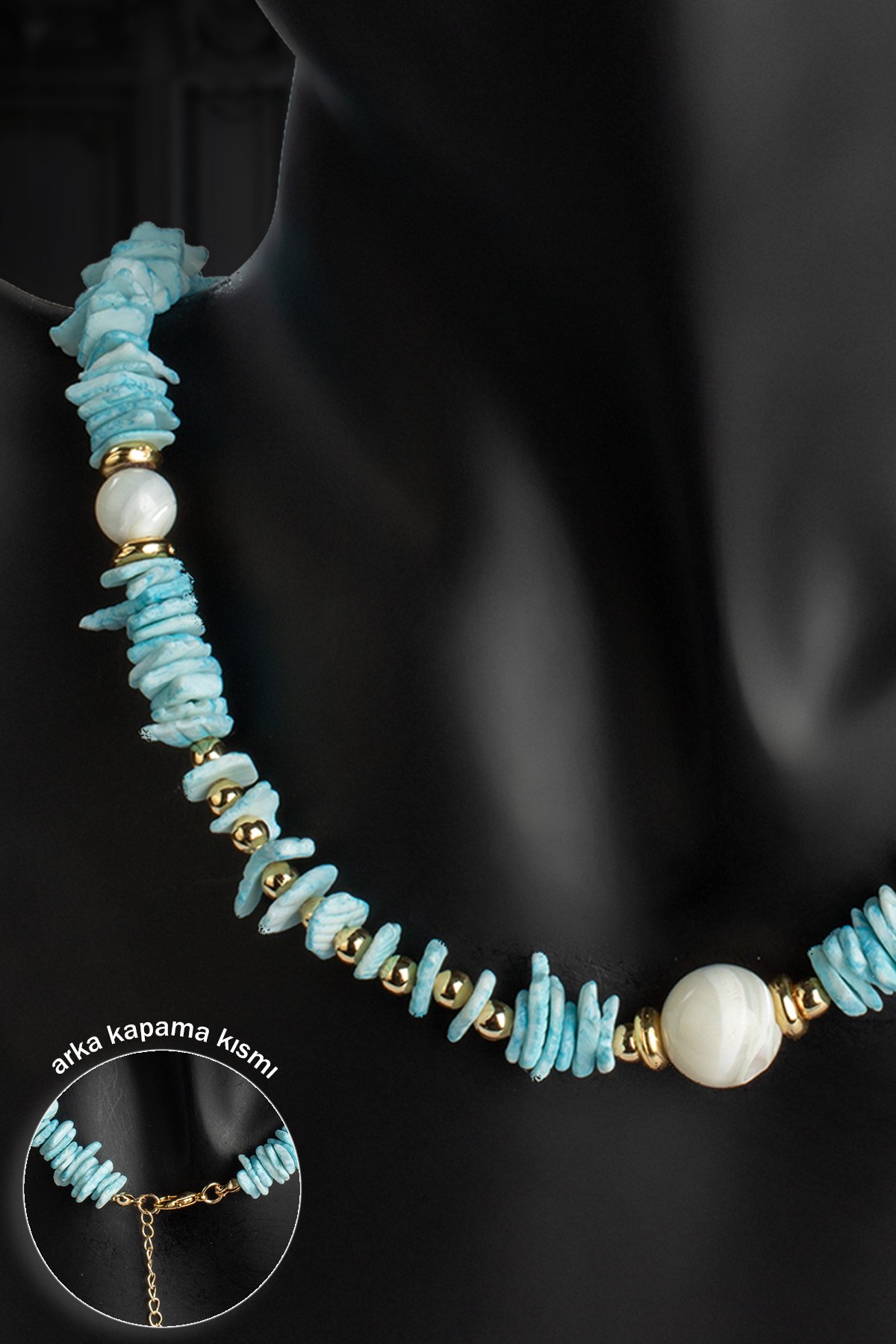 Sedef - Mercan Doğal Kırık Taş Buz Mavisi Zincir Kapamalı Kolye