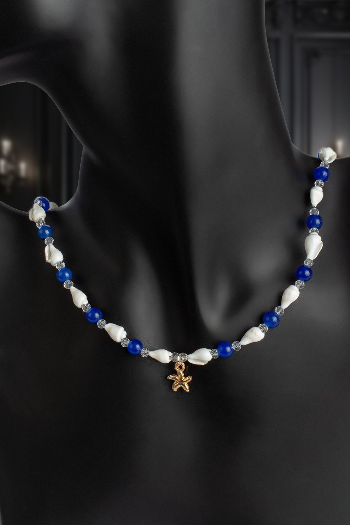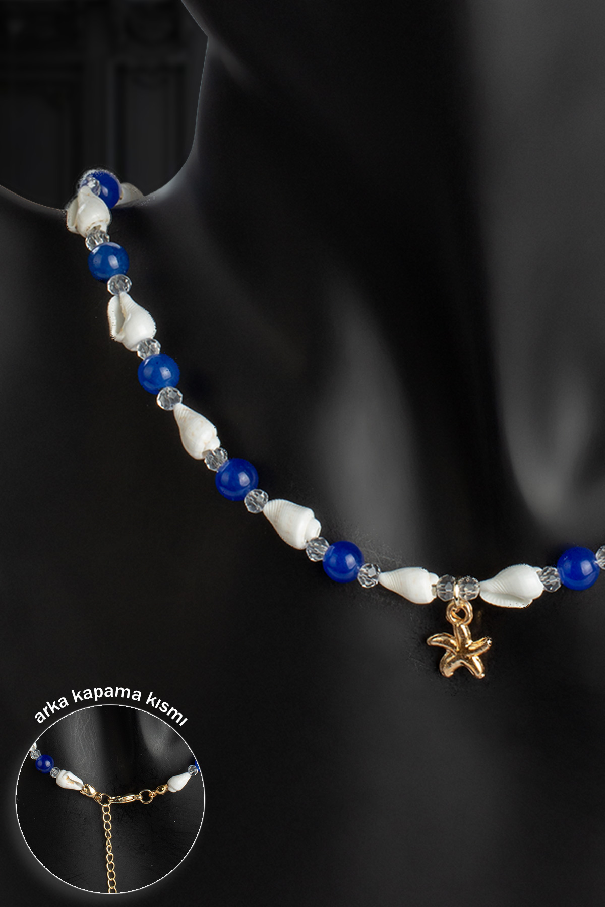 Sıkma Doğal Taş Lacivert Küre Kesim & İstridye Deniz Kabuğu Kolye