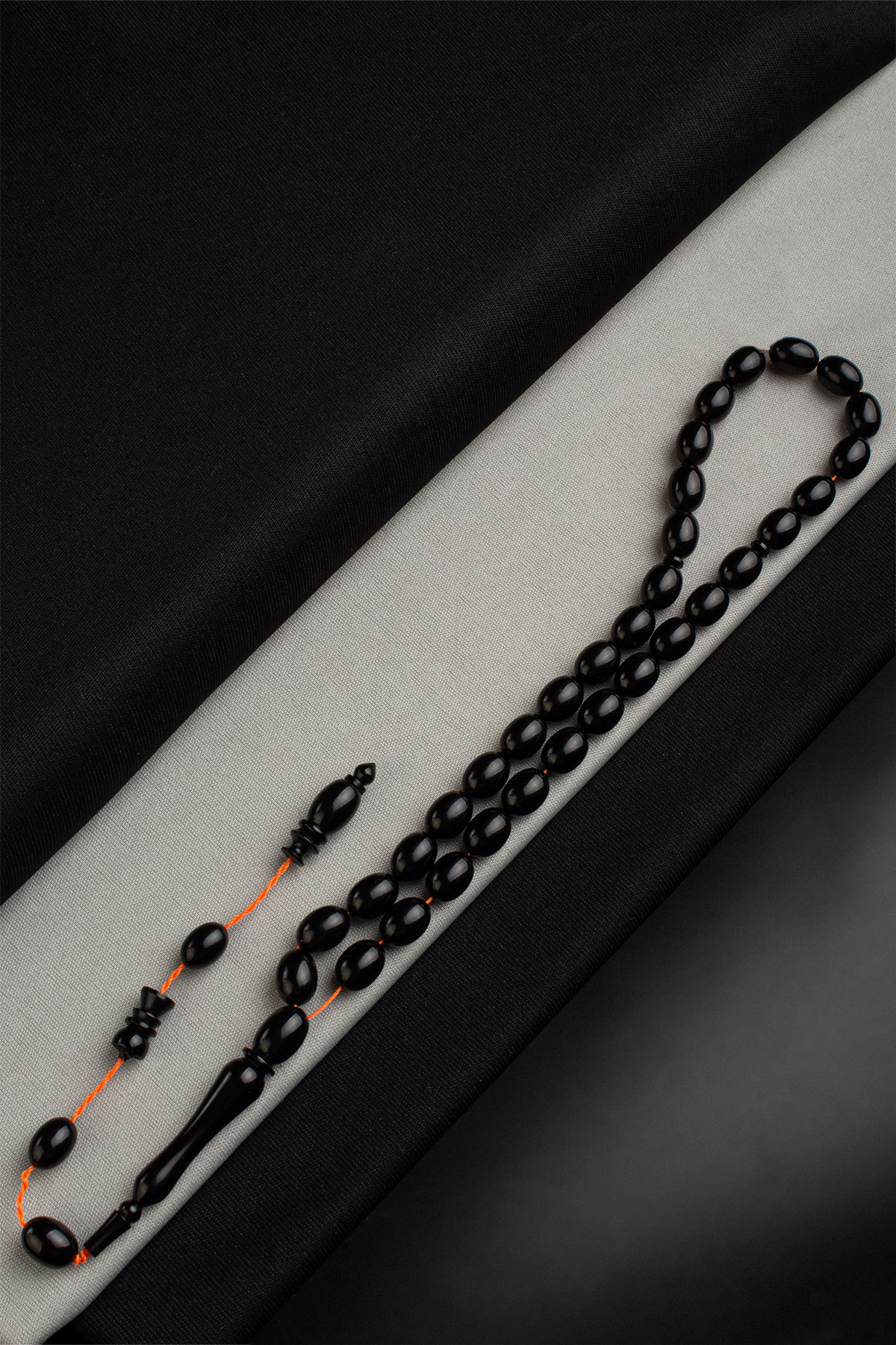 Sıkma Kehribar Siyah Arpa Kesim 8x10mm 33 Lu Tesbih