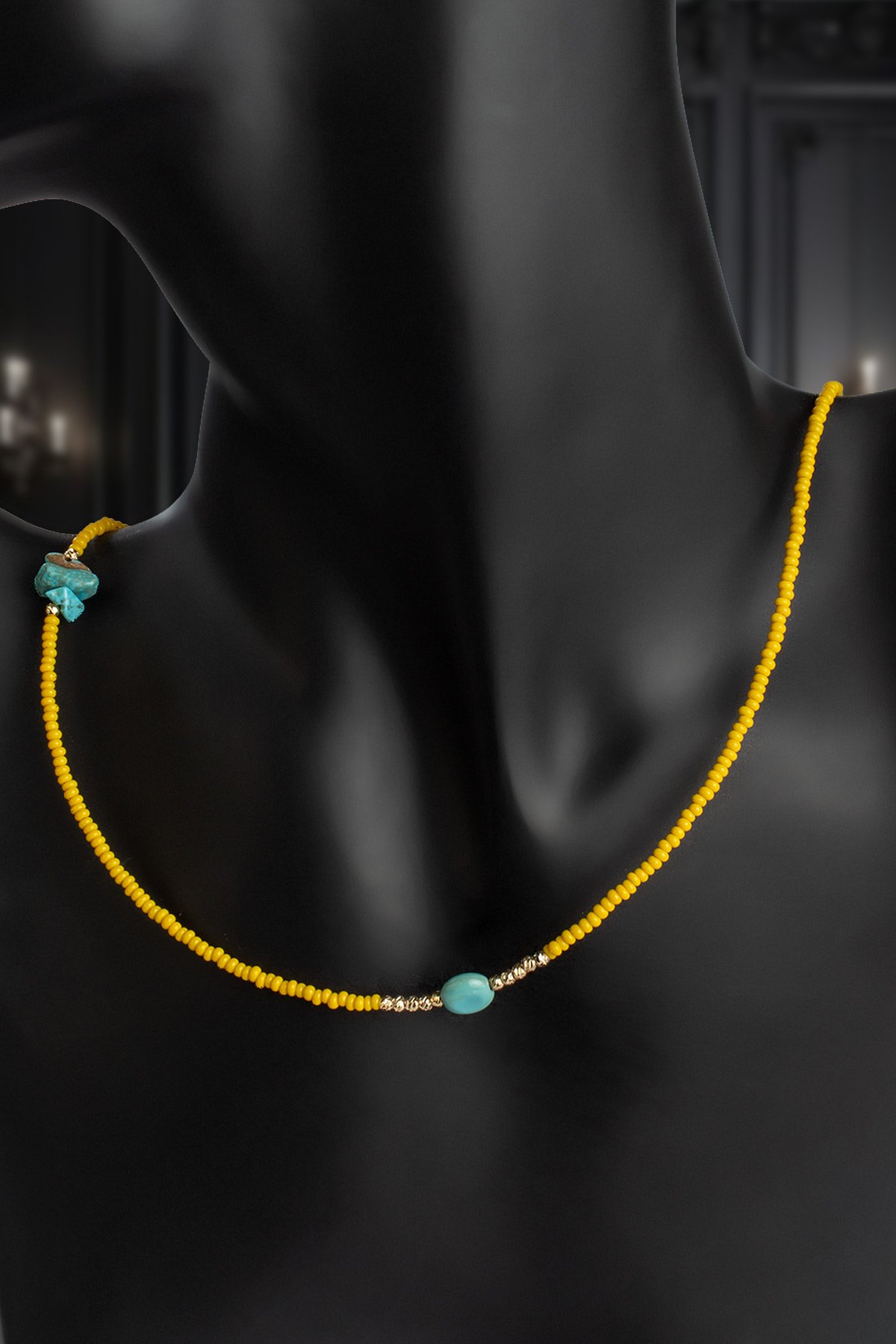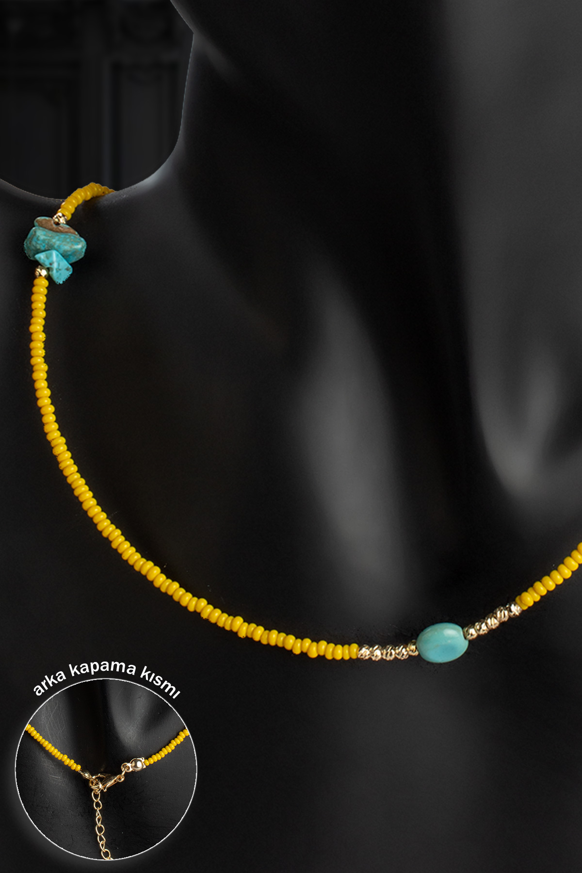 Turkuaz Doğal Kırık Taş & Sarı Kum Boncuk Zincir Kapamalı Kolye (KLYDGL-0430)