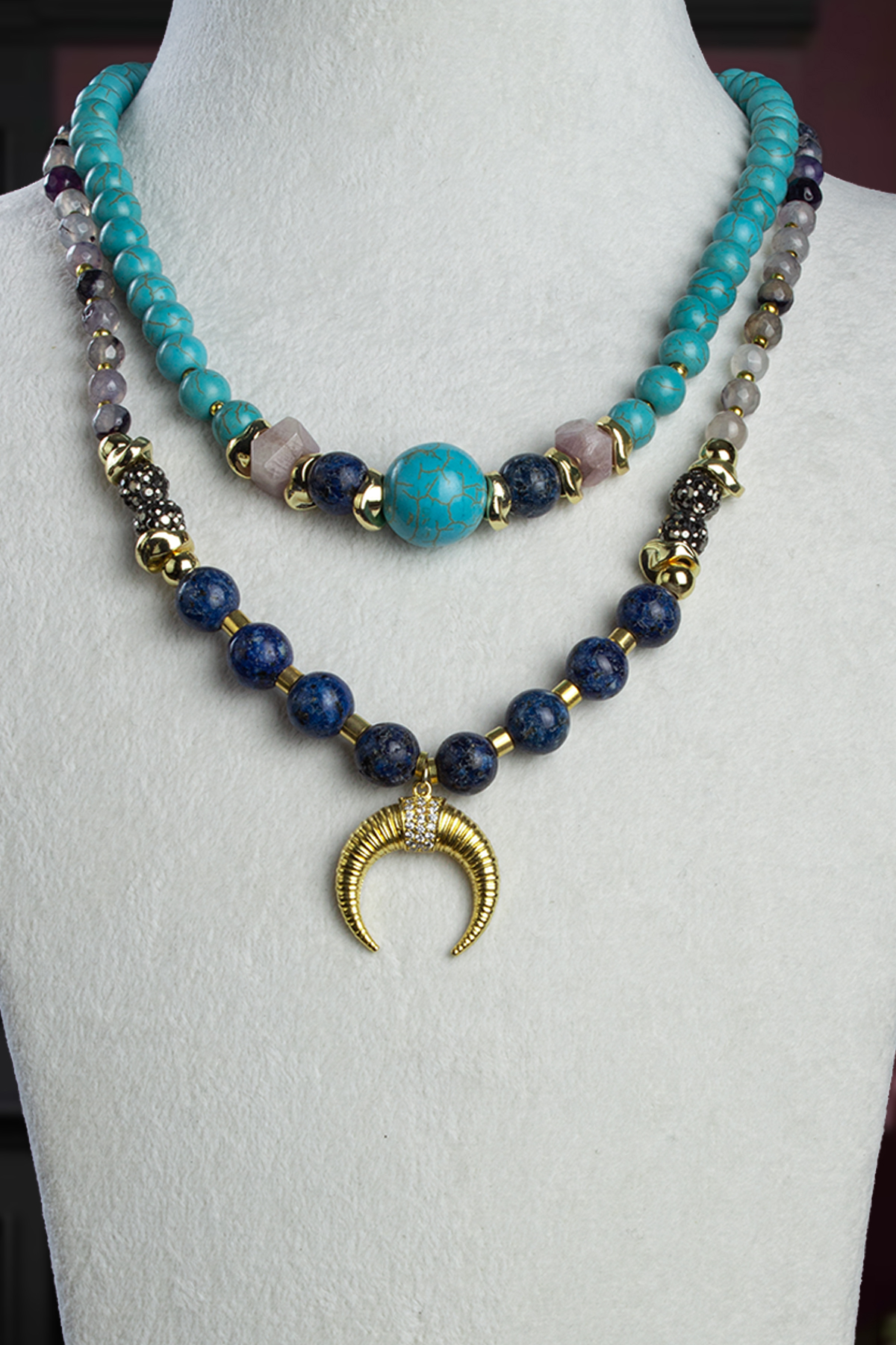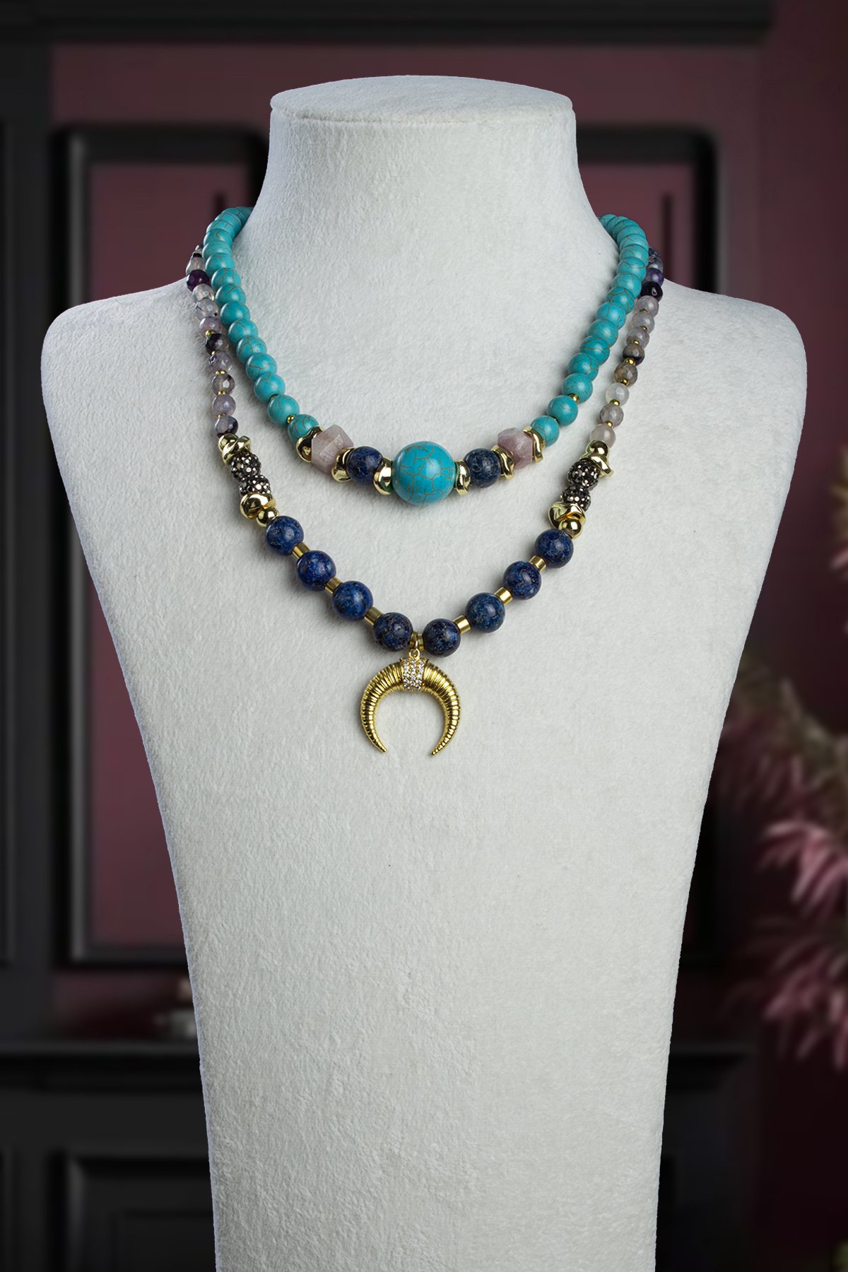 Turkuaz Doğal Taş Karışık Ay Motifli Zincir Kapamalı Kolye