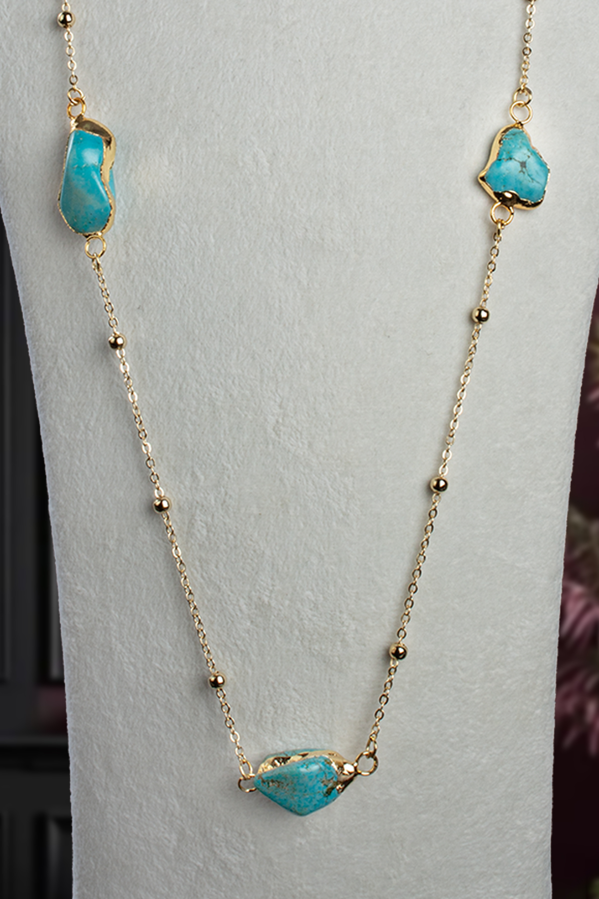 Turkuaz Doğal Taş Tamburlu Kütle Taş Uzun Zincir Kolye (KLYDGL-0639)