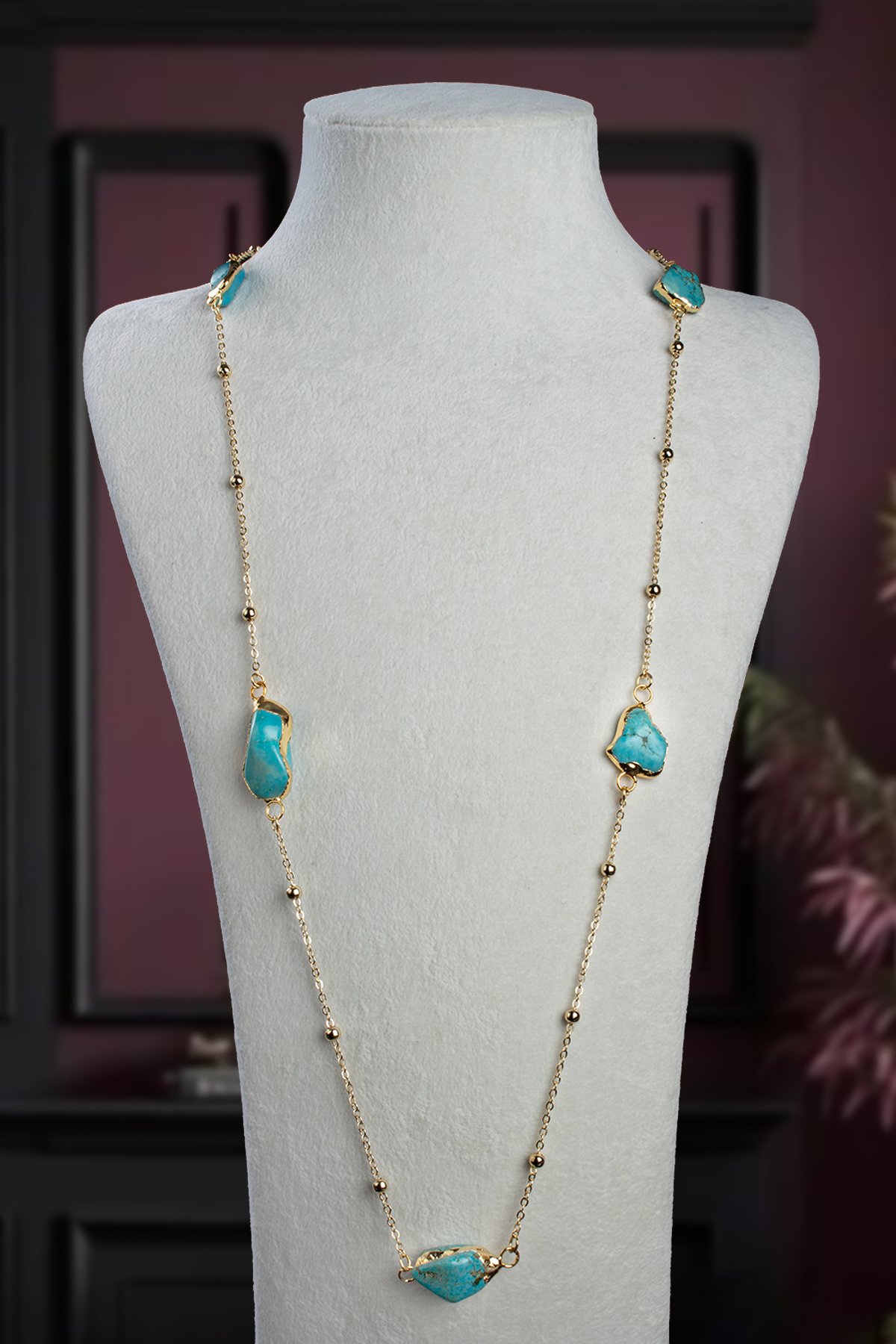 Turkuaz Doğal Taş Tamburlu Kütle Taş Uzun Zincir Kolye