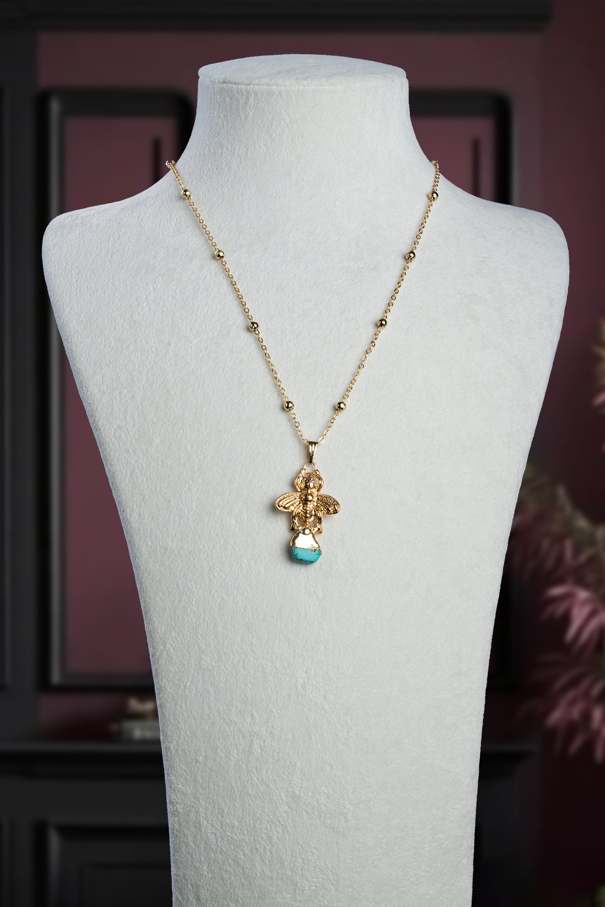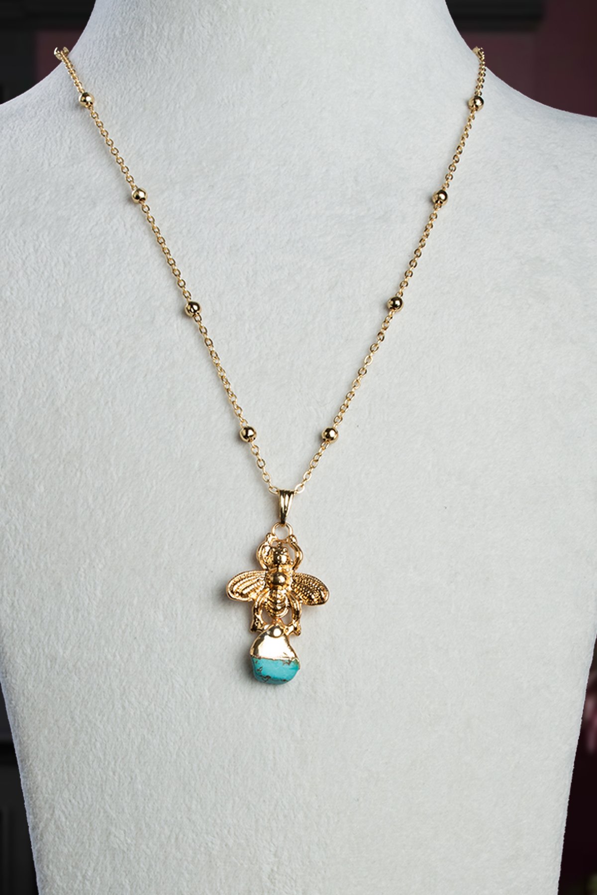 Turkuaz Doğal Taş Tımbıl Kesim Arı Figürlü Lak Kaplama Kolye