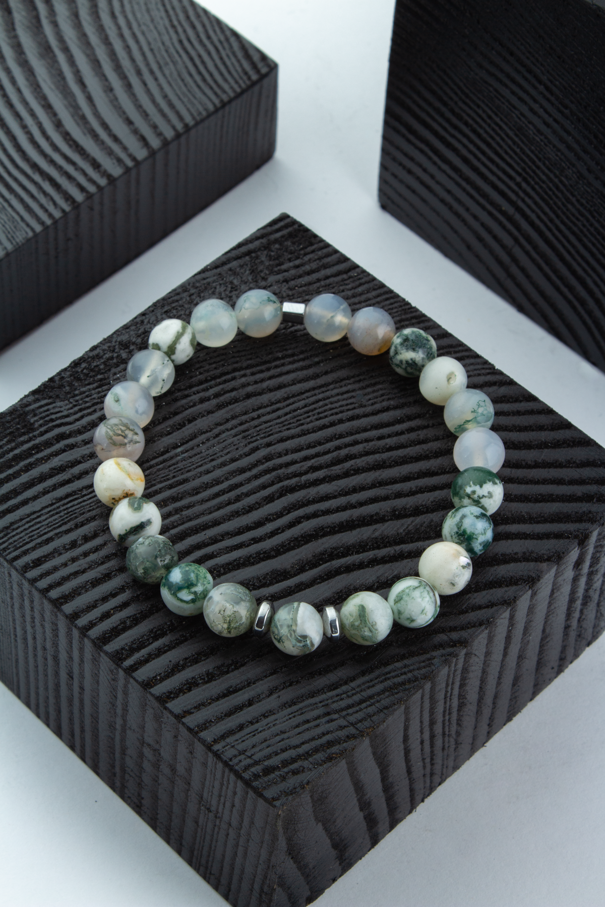 Yosunlu Akik Doğal Taş Yeşil Beyaz Küre Kesim 8mm Bileklik (BLKMSN-0112)